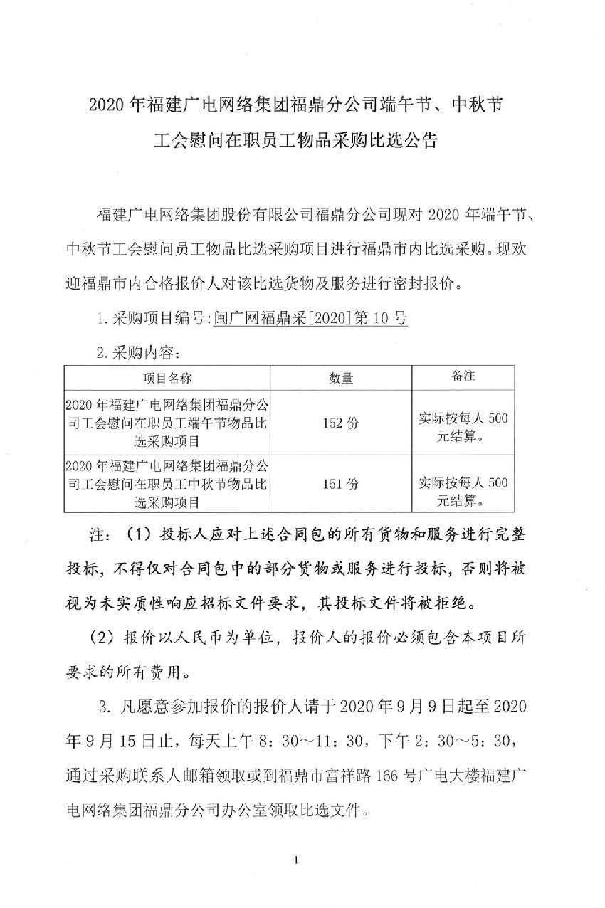 2020年福鼎分公司工会慰问在职员工端午节、中秋节物品采购比选公告