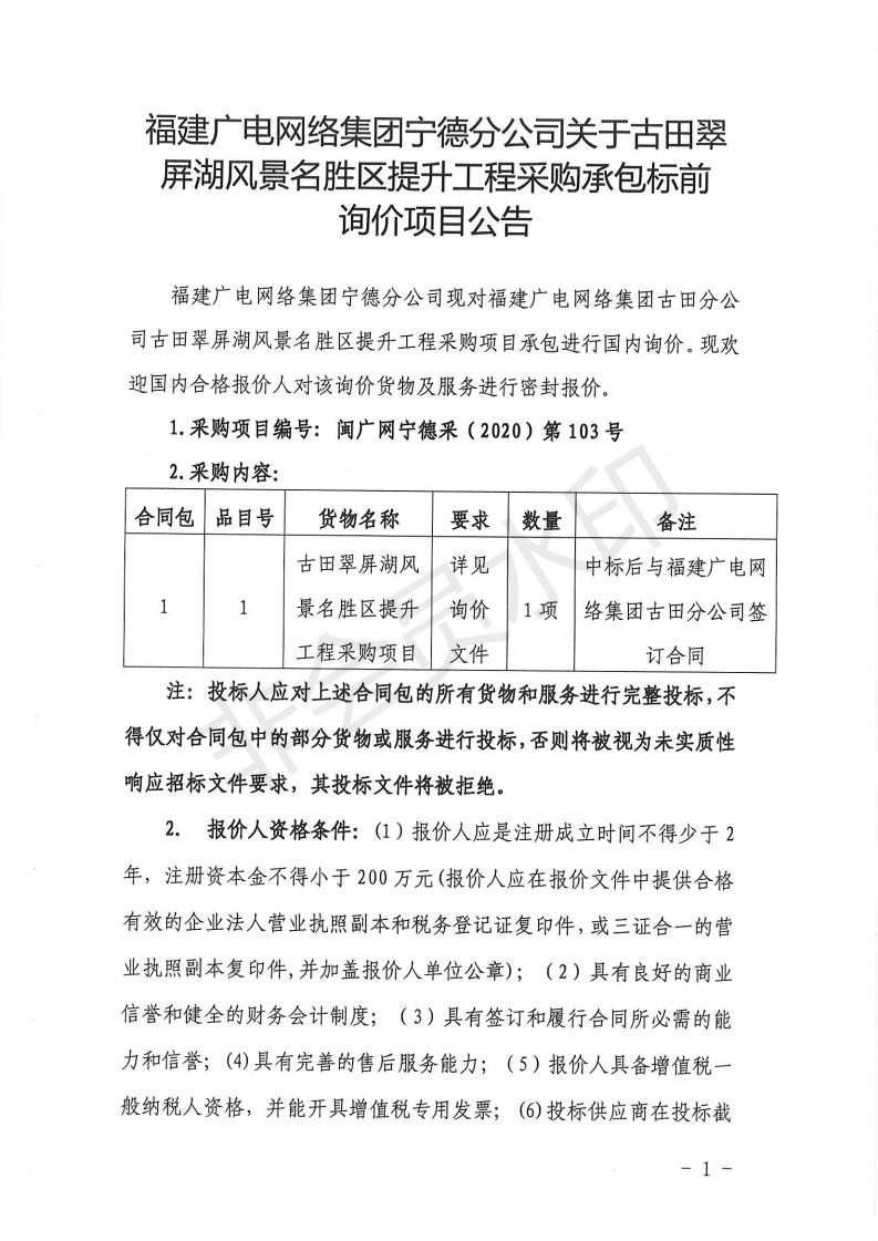 古田翠屏湖风景名胜区提升工程采购承包标前询价项目公告