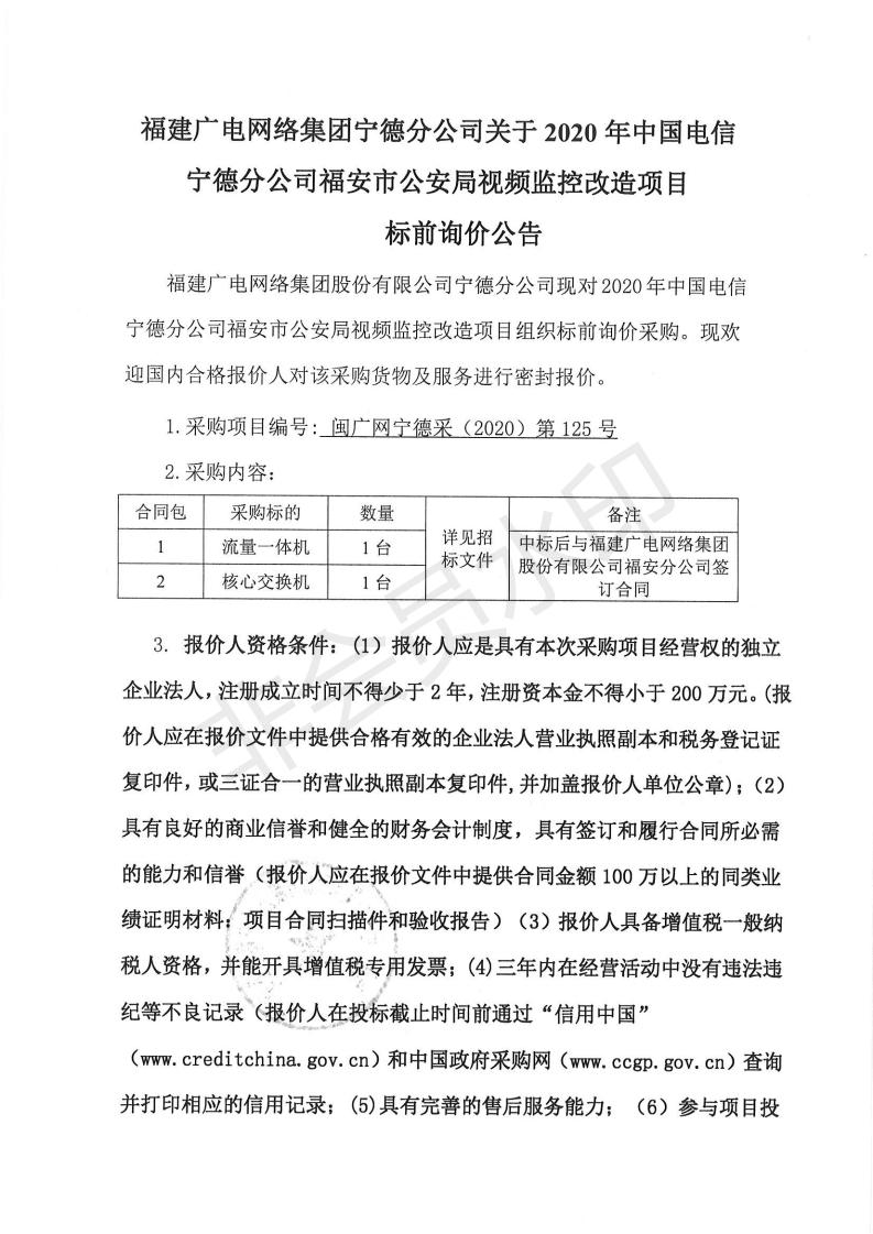 2020年中国电信宁德分公司福安市公安局视频监控改造项目标前询价公告