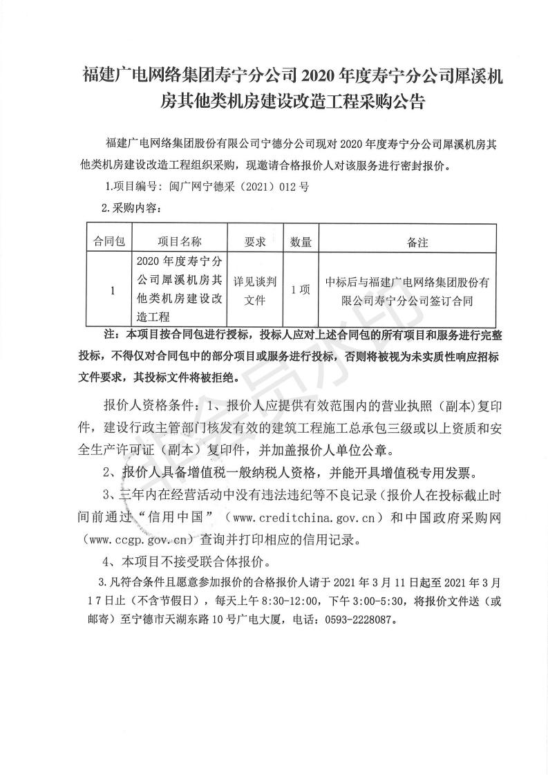 寿宁分公司犀溪机房其他类机房建设改造工程采购公告