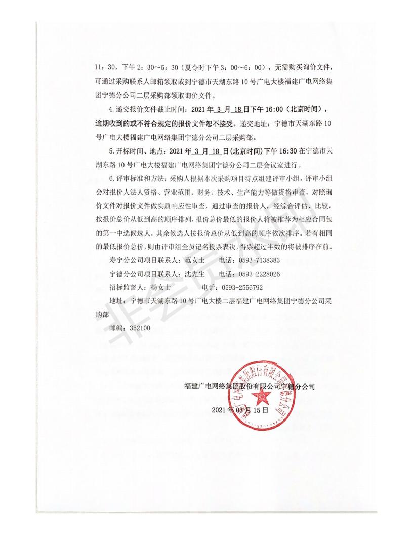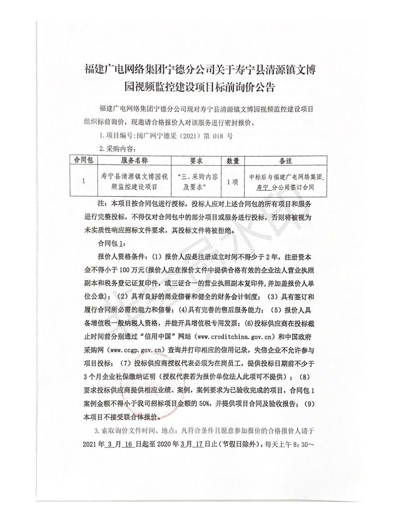 寿宁县清源镇文博园视频监控建设项目标前询价公告