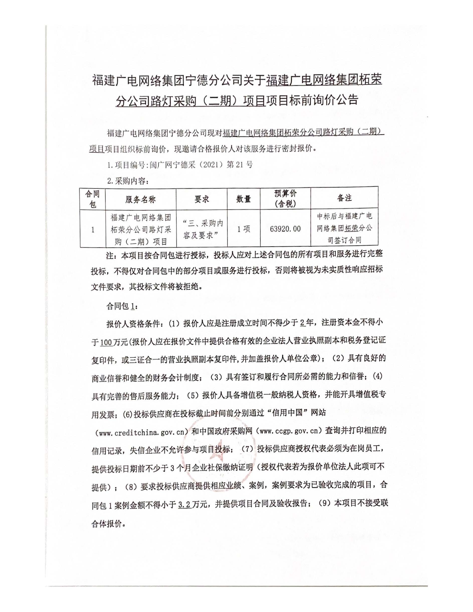 柘荣分公司路灯采购(二期)项目标前询价公告