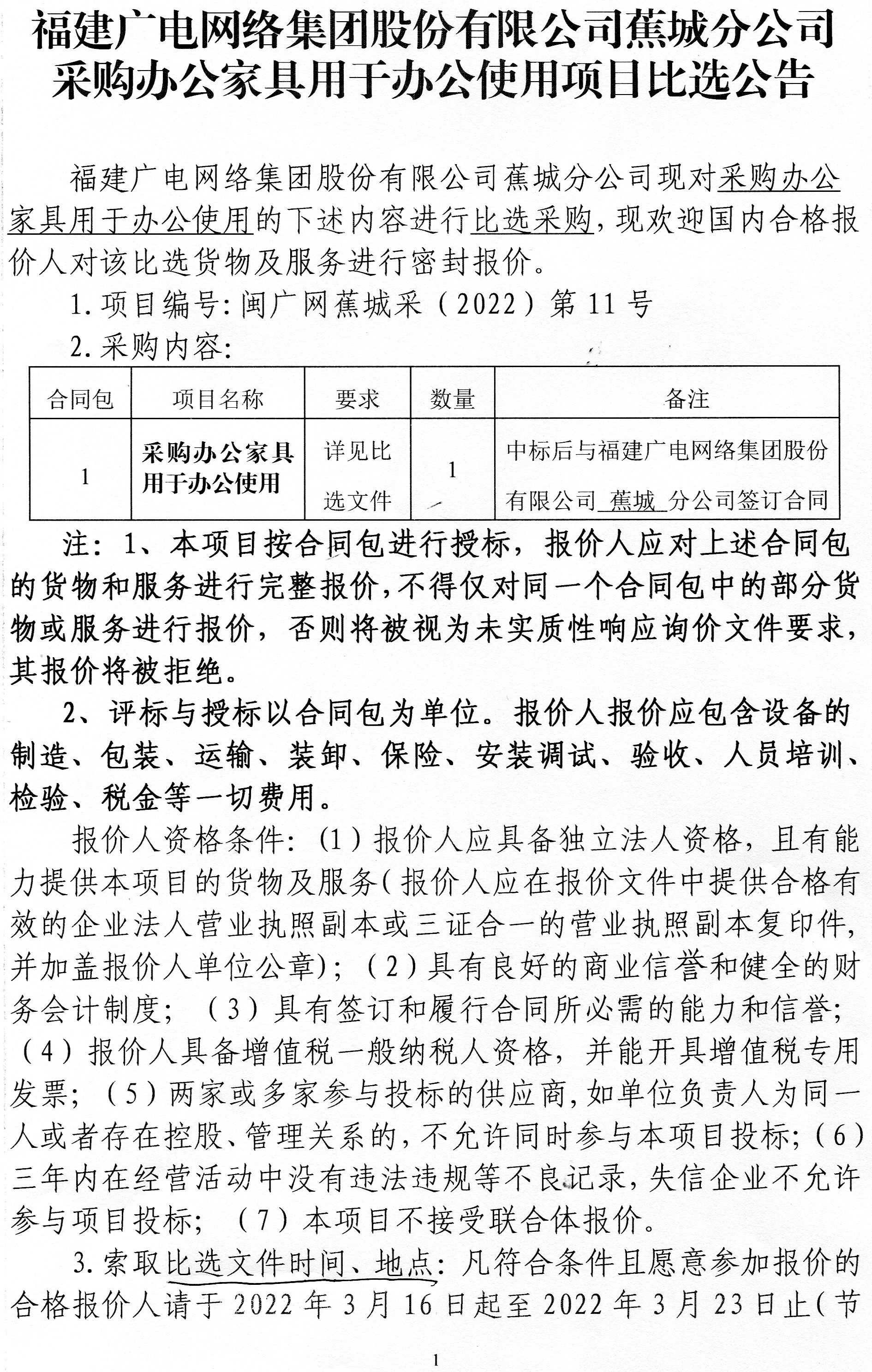 蕉城分公司采购办公家具用于办公使用项目比选公告