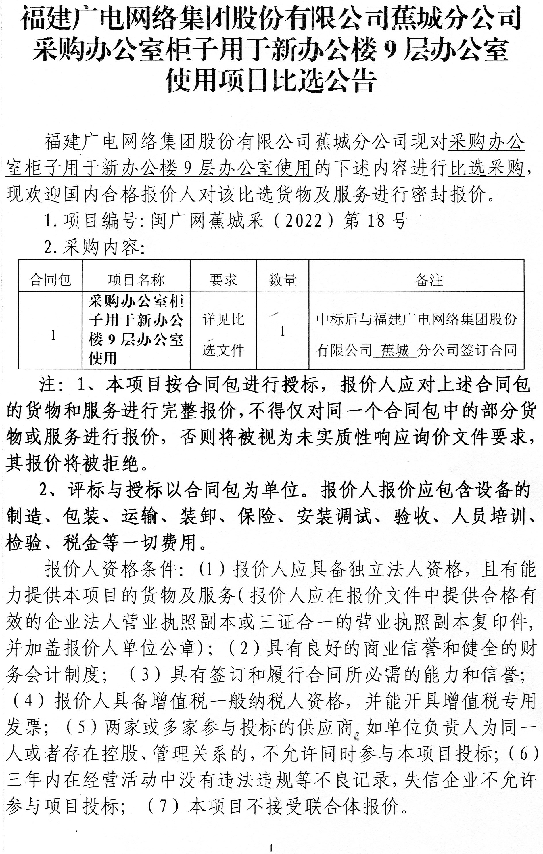 蕉城分公司采购办公室柜子用于新办公楼9层办公室使用项目比选公告