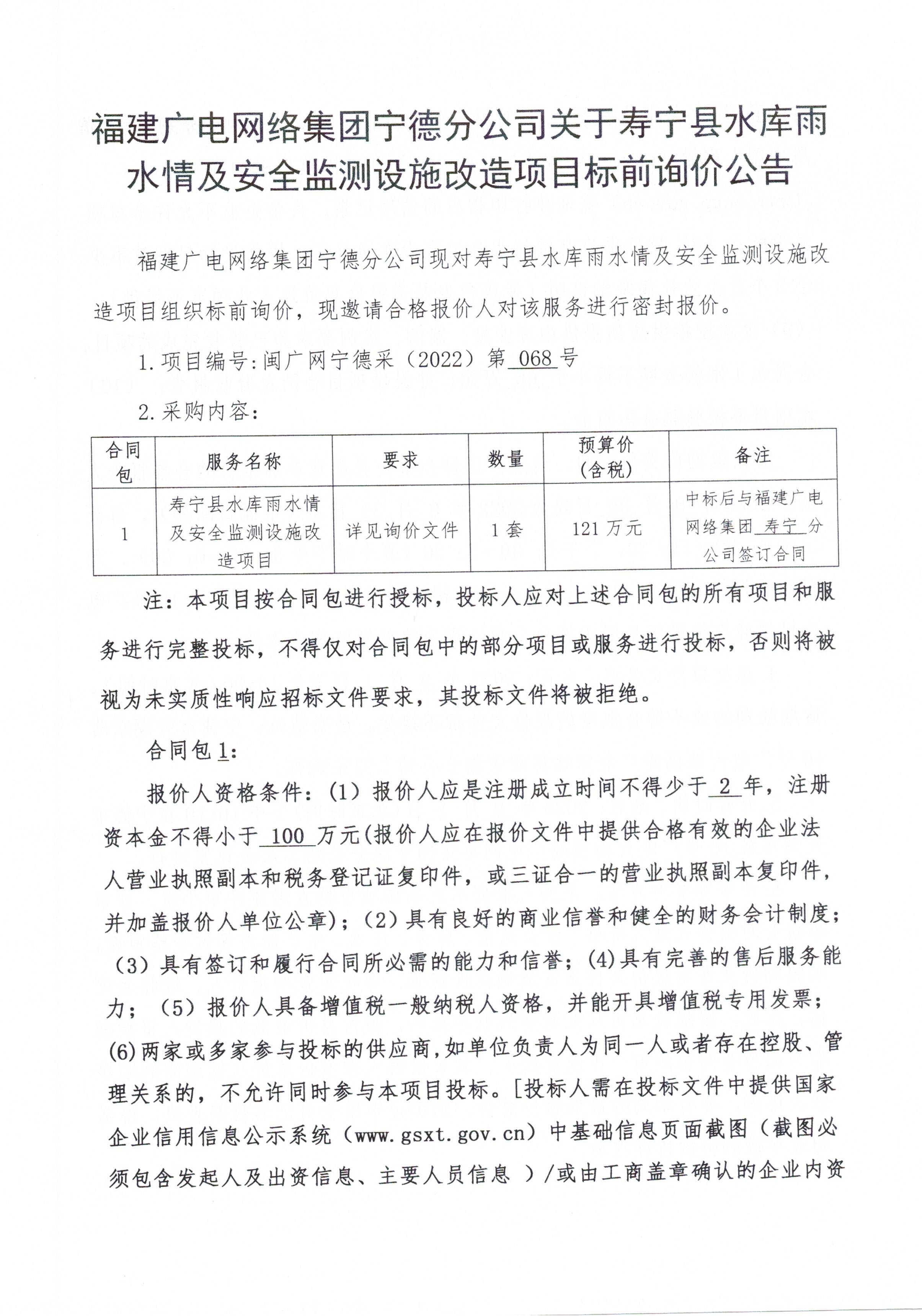 寿宁分公司水库雨水情及安全监测设施改造项目询价公告