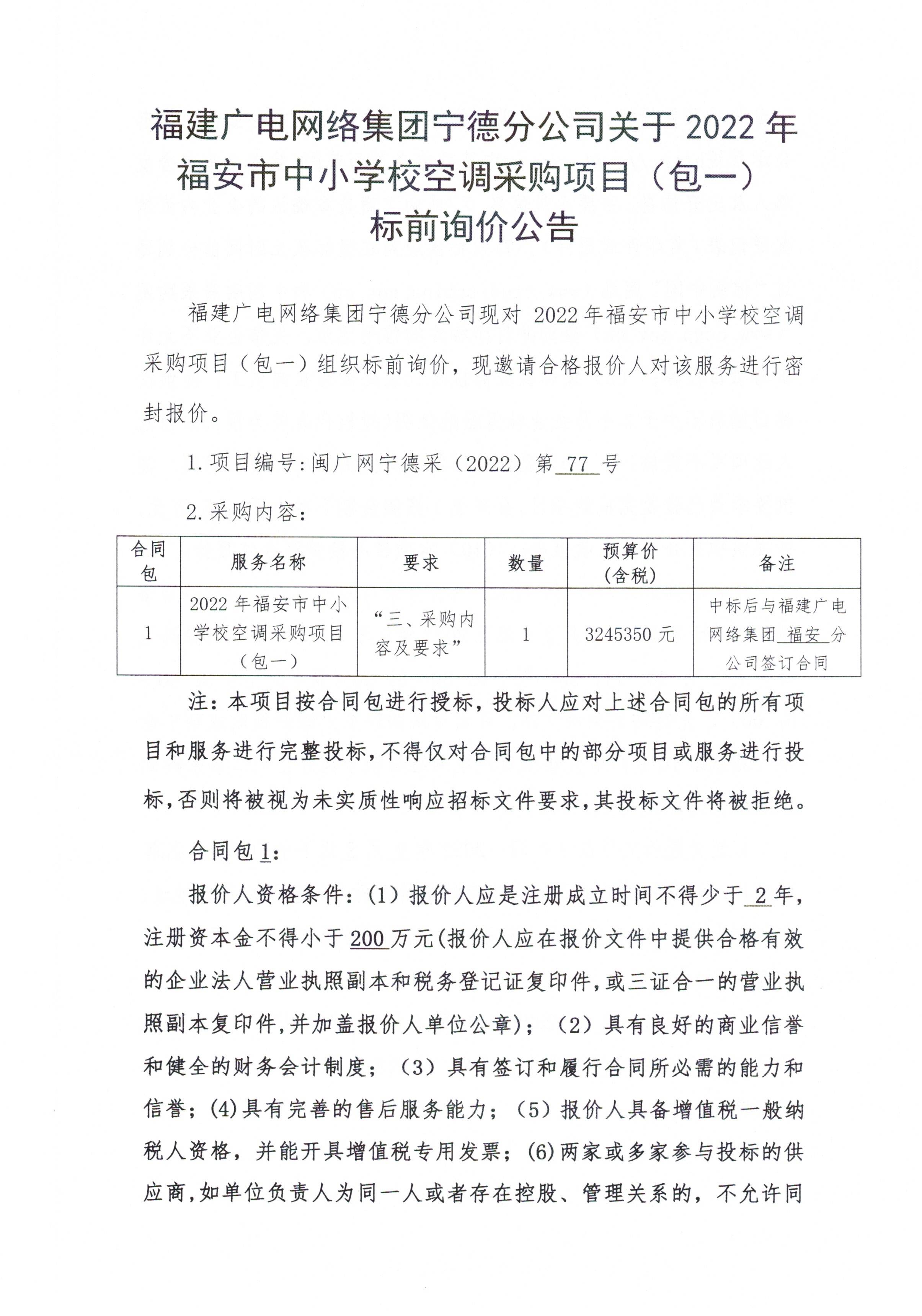 2022年福安市中小学校空调采购项目(包一)标前询价公告