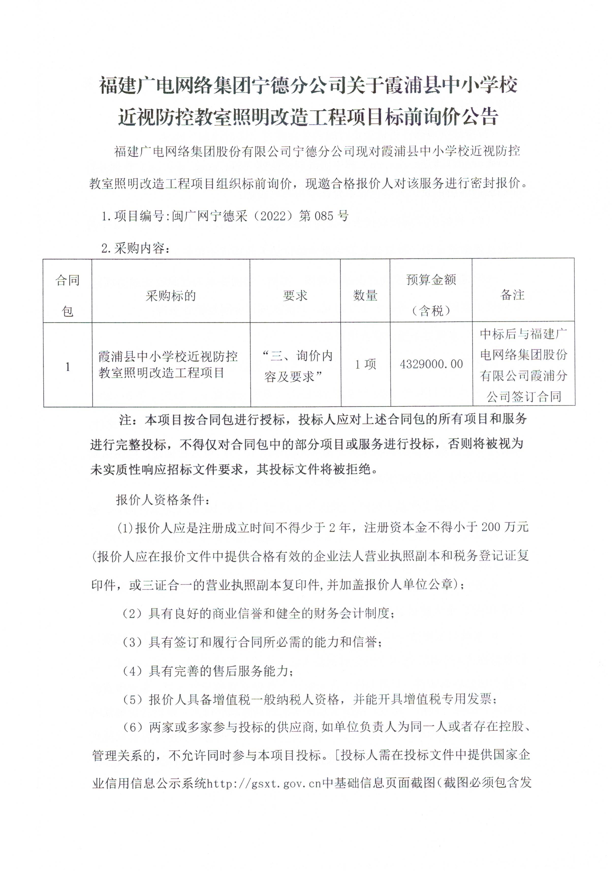 霞浦中小学近视防控教学照明改造工程项目标前询价公告