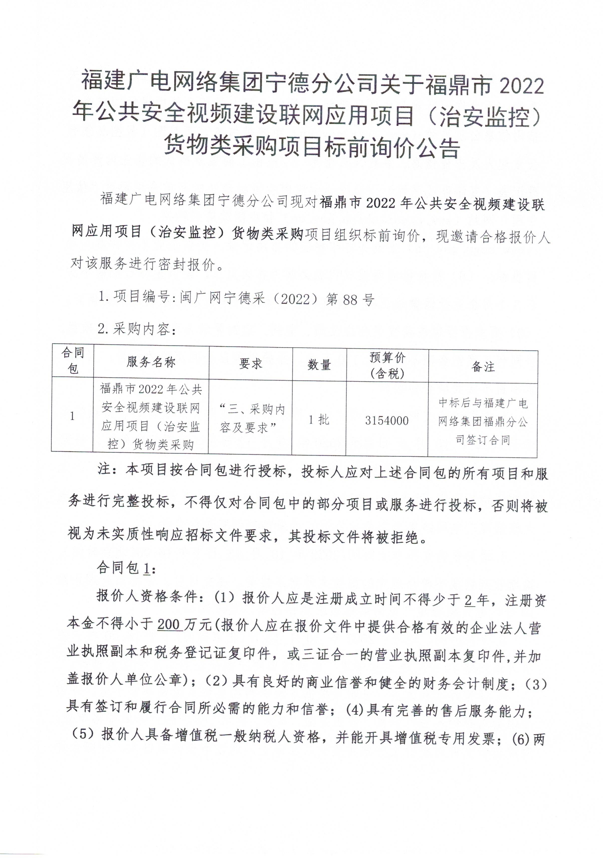 福鼎市2022年公共安全视频建设联网应用项目(治安监控)货物类采购项目标前询价公告