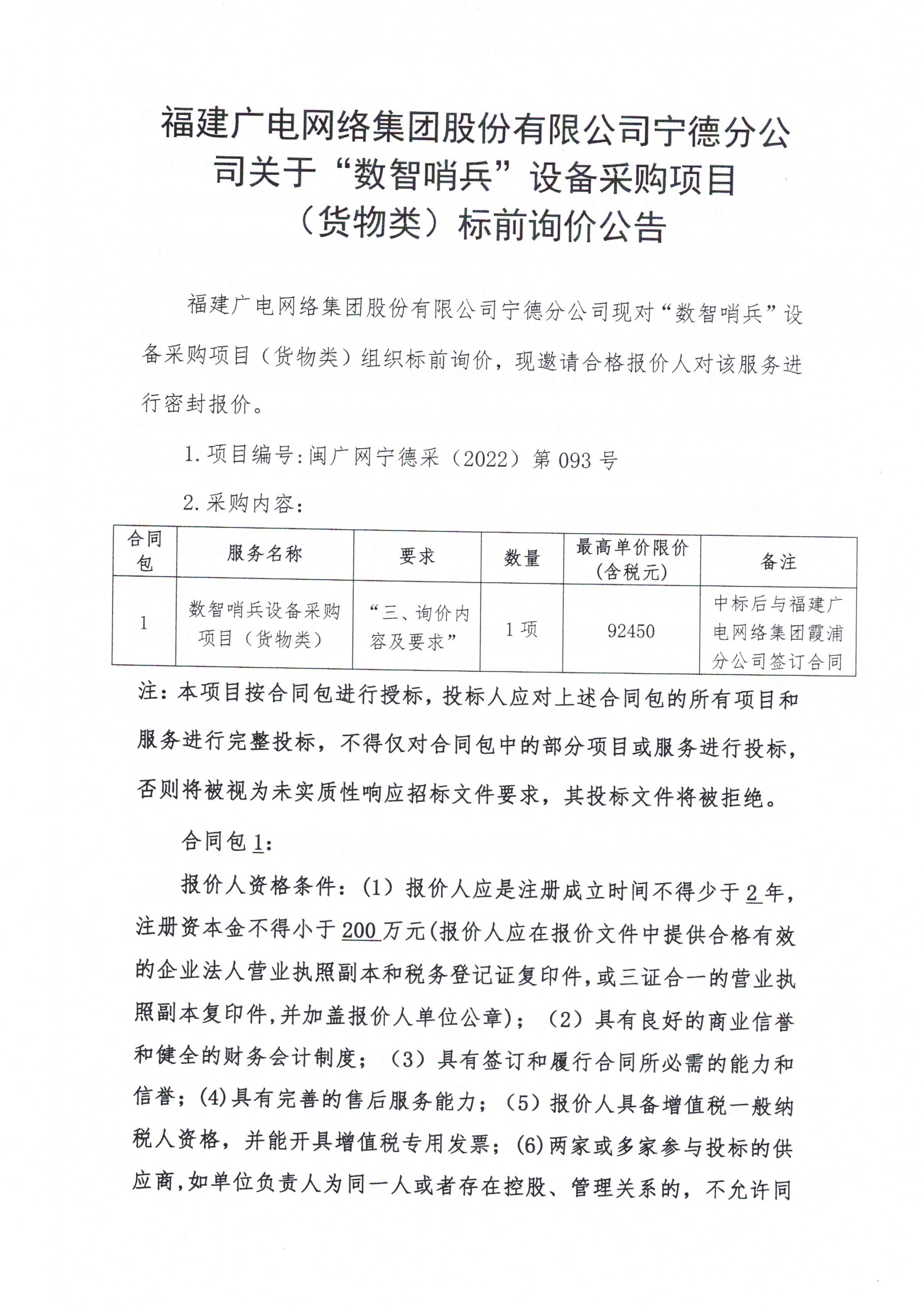 “数智哨兵”设备采购项目(货物类)标前询价公告