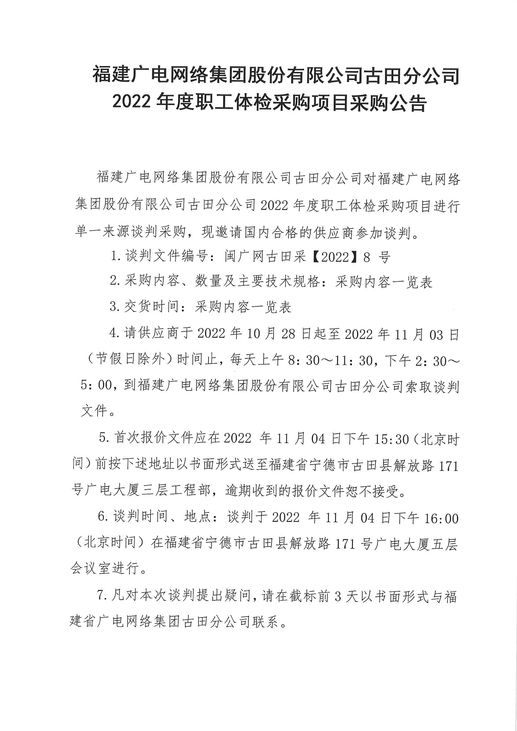 古田分公司2022年度职工体检采购项目采购公告