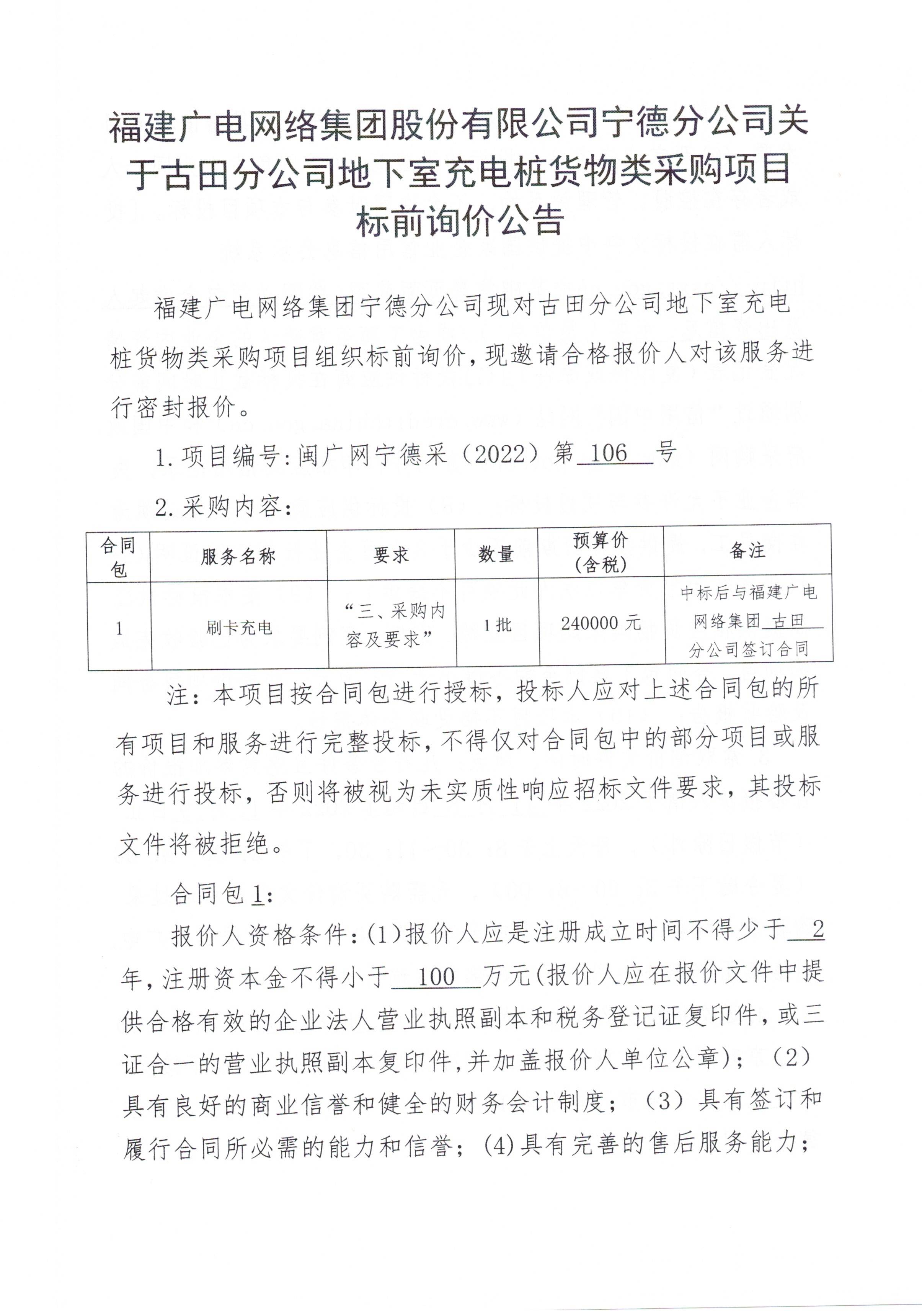 宁德分公司关于古田分公司地下室充电桩货物类采购项目标前询价公告