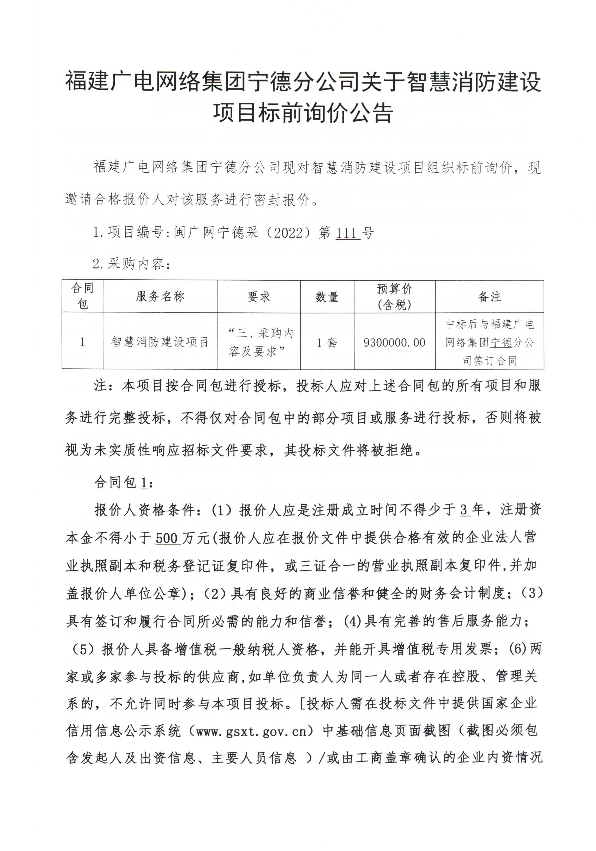宁德分公司关于智慧消防建设项目标前询价公告