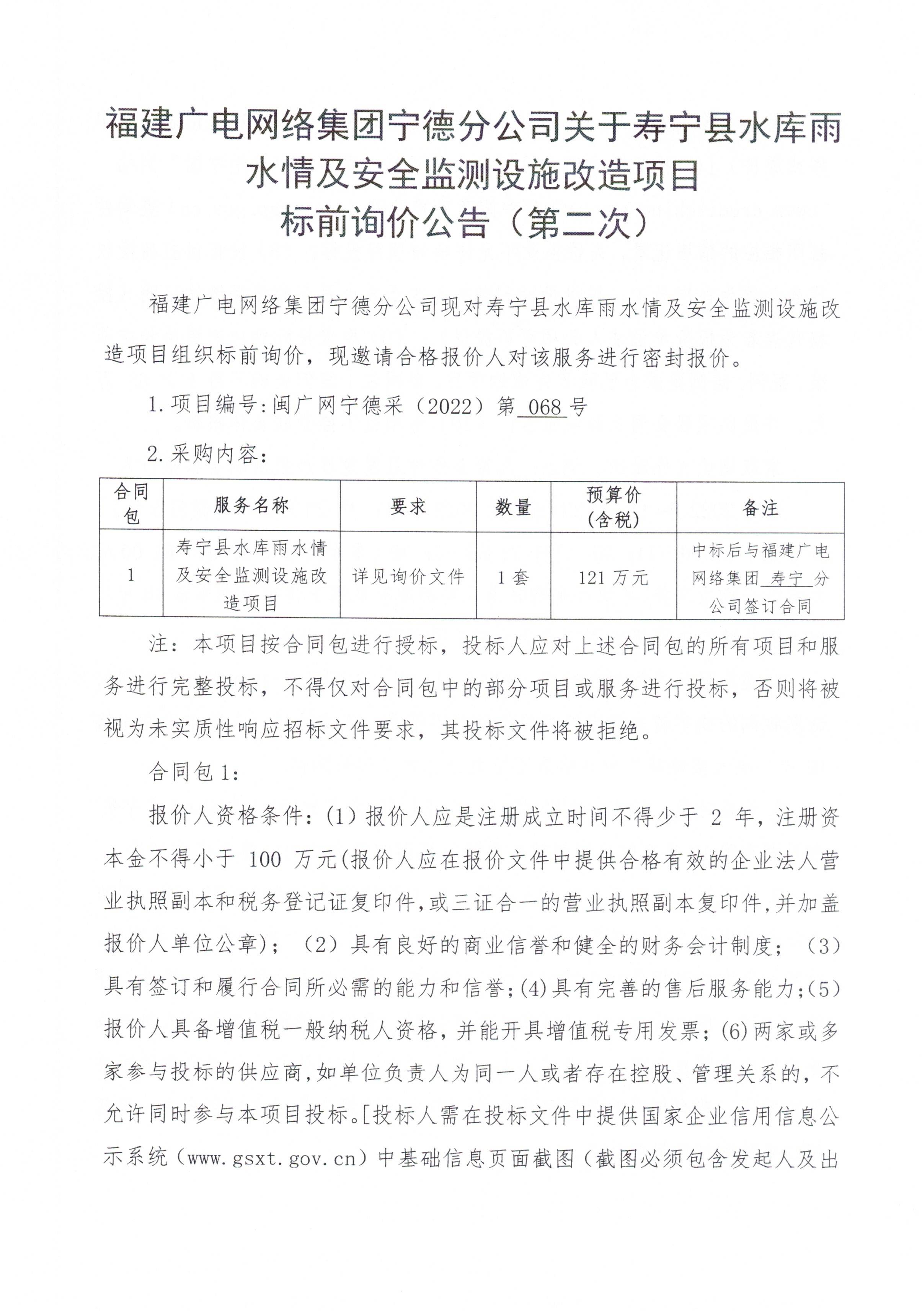 宁德分公司关于寿宁县水库雨水情及安全监测设施改造项目标前询价公告(第二次)