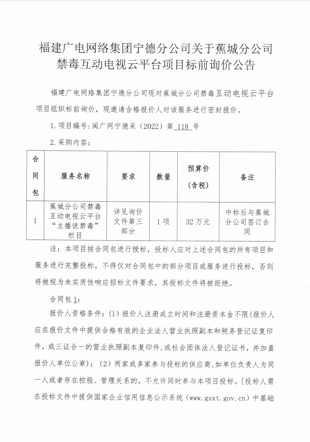 宁德分公司关于蕉城分公司禁毒互动电视云平台项目标前询价公告