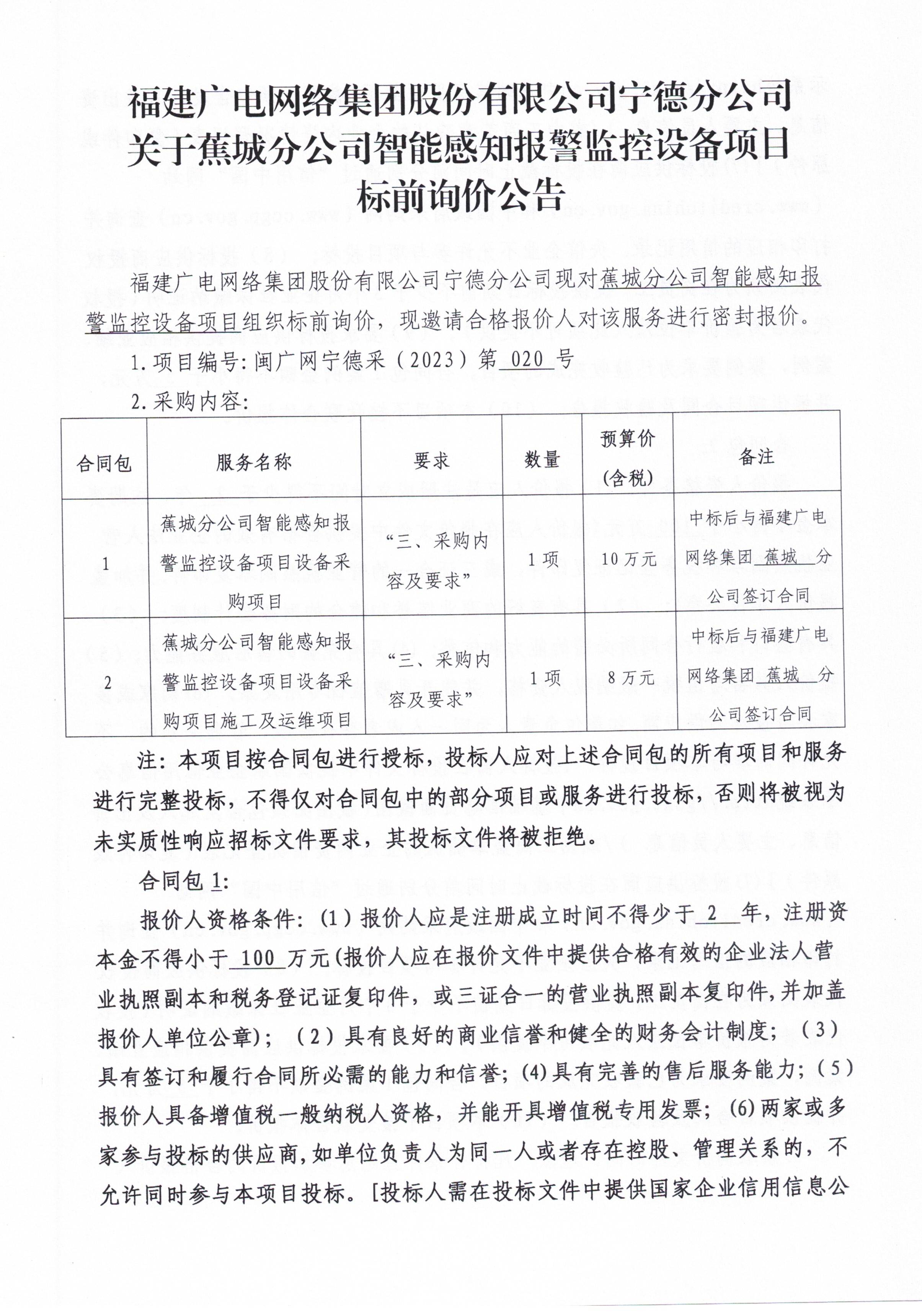 新利网上注册首页(中国)官方网站宁德分公司关于蕉城分公司智能感知报警监控设备项目标前询价公告