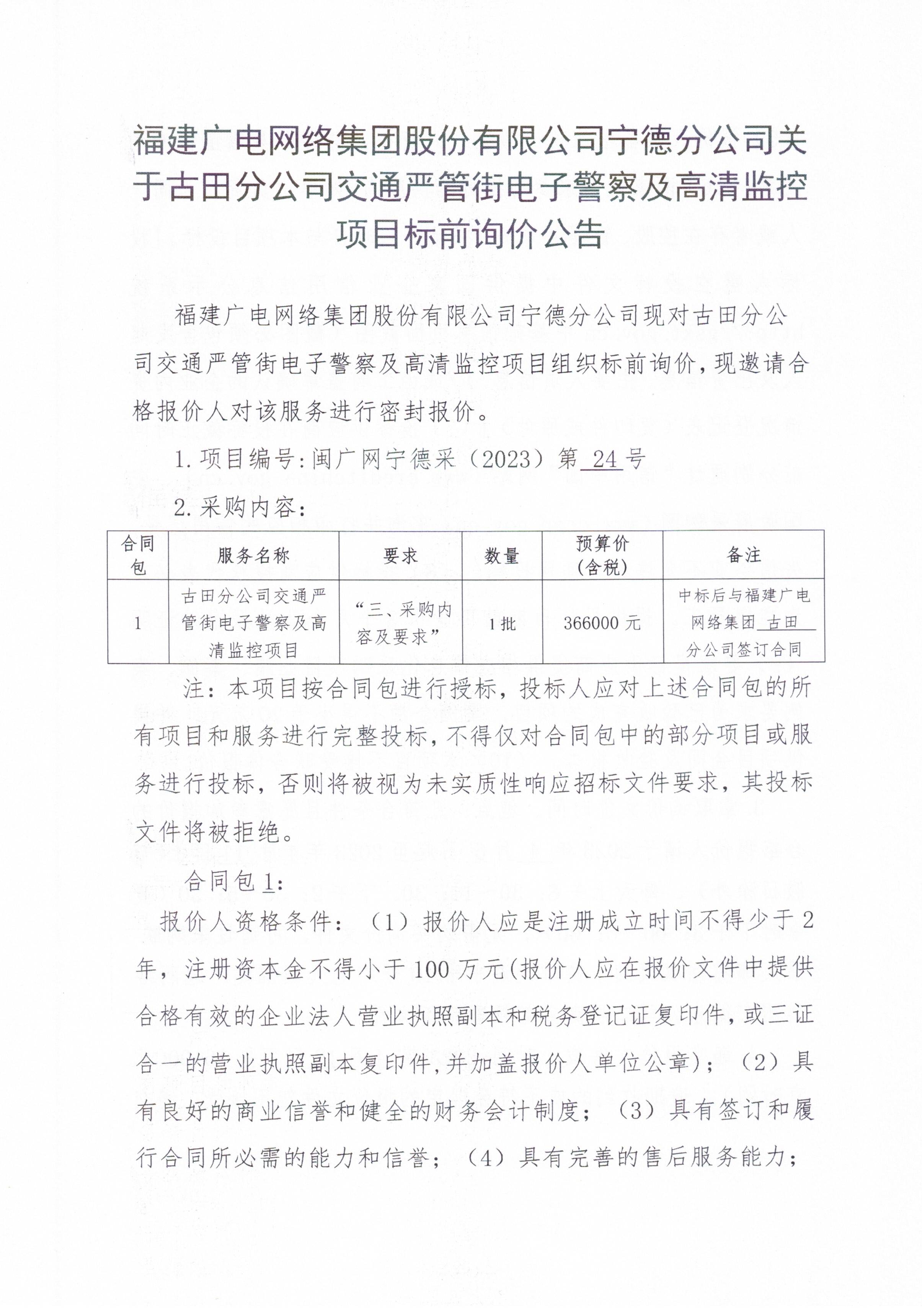 新利网上注册首页(中国)官方网站宁德分公司关于古田分公司交通严管街电子警察及高清监控项目标前询价公告