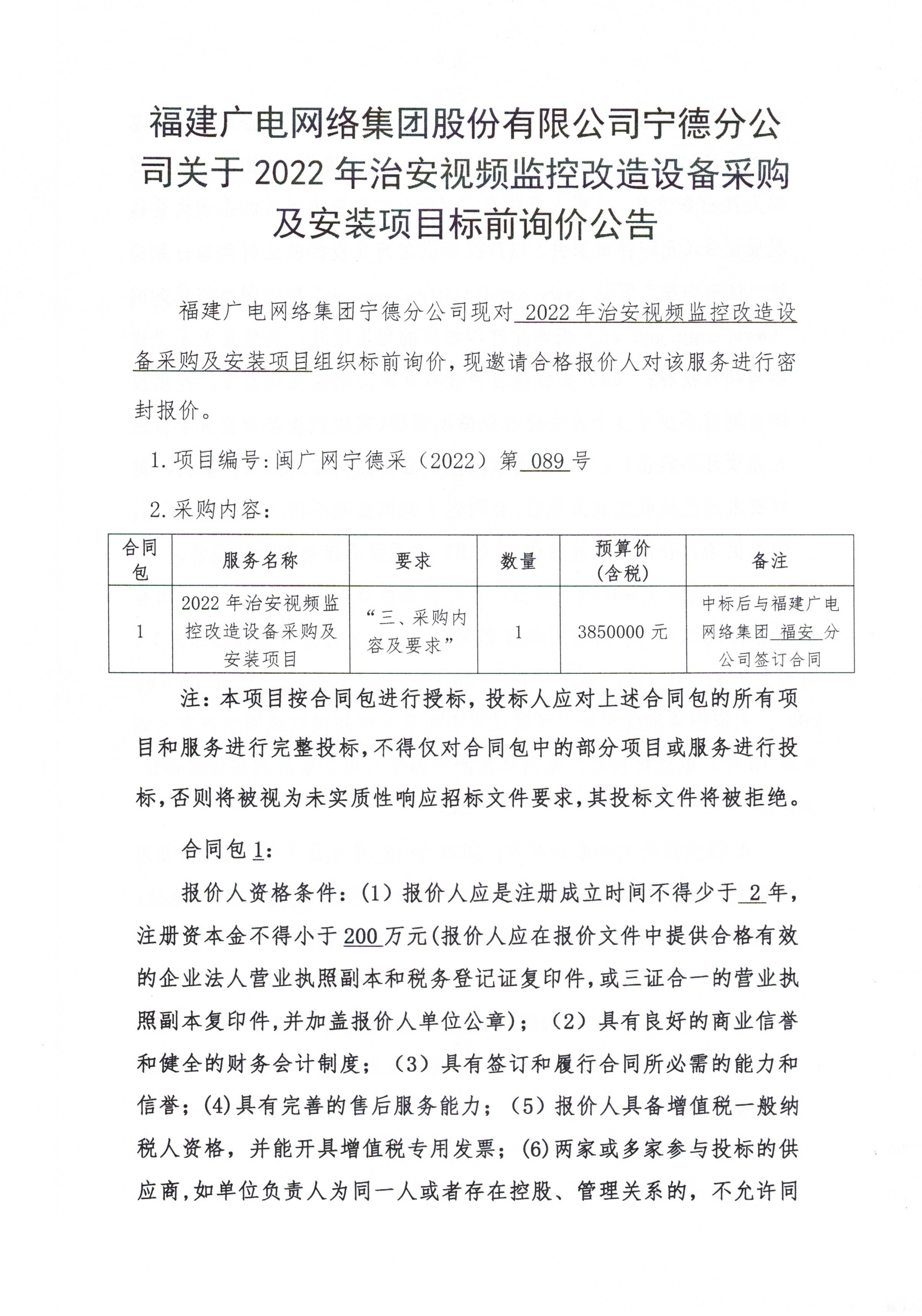 新利网上注册首页(中国)官方网站宁德分公司关于2022年治安视频监控改造设备采购及安装项目标前询价公告