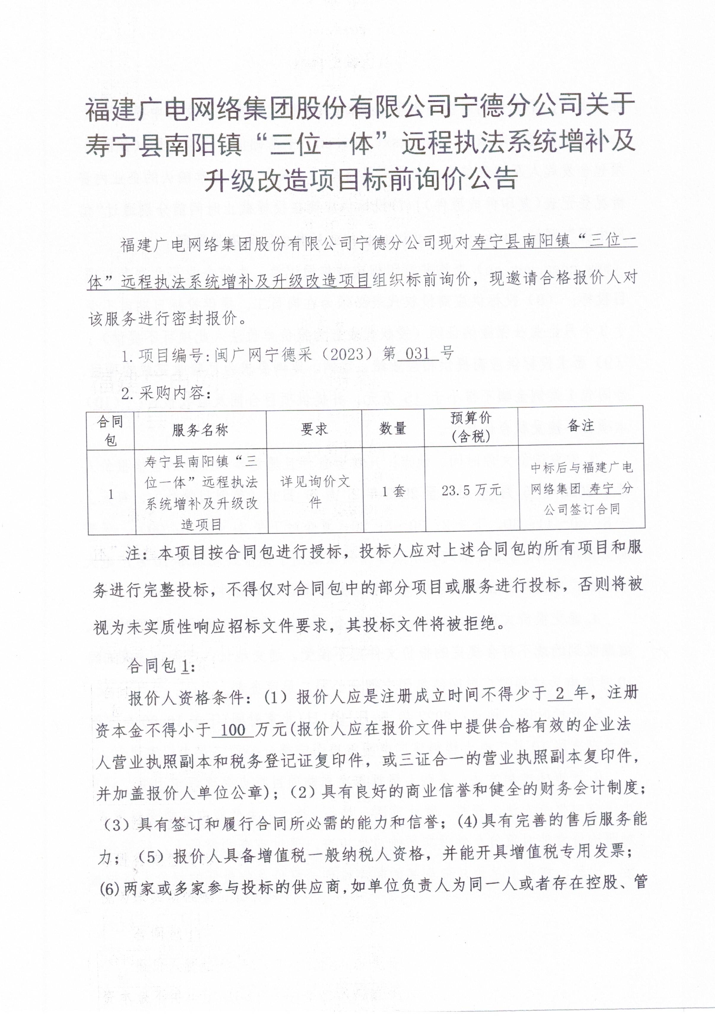 新利网上注册首页(中国)官方网站宁德分公司关于寿宁县南阳镇“三位一体”远程执法系统增补及升级改造项目标前询价公告