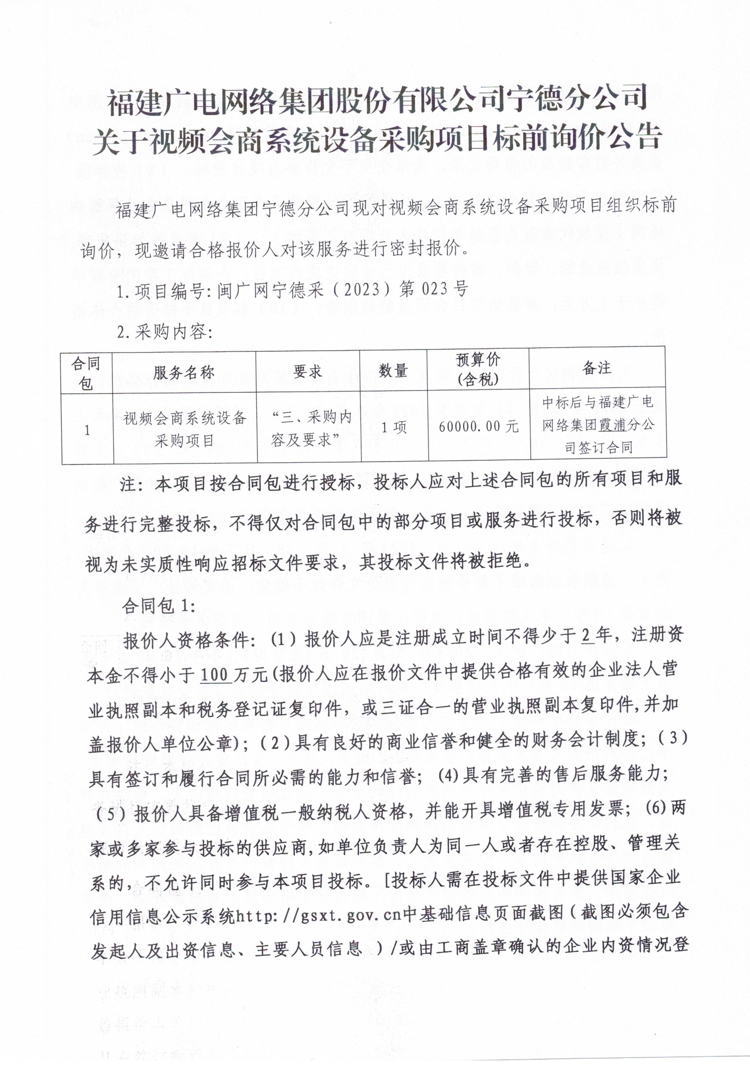 闽广网宁德采(2023)第023号新利网上注册首页(中国)官方网站宁德分公司关于霞浦分公司视频会商系统设备采购项目