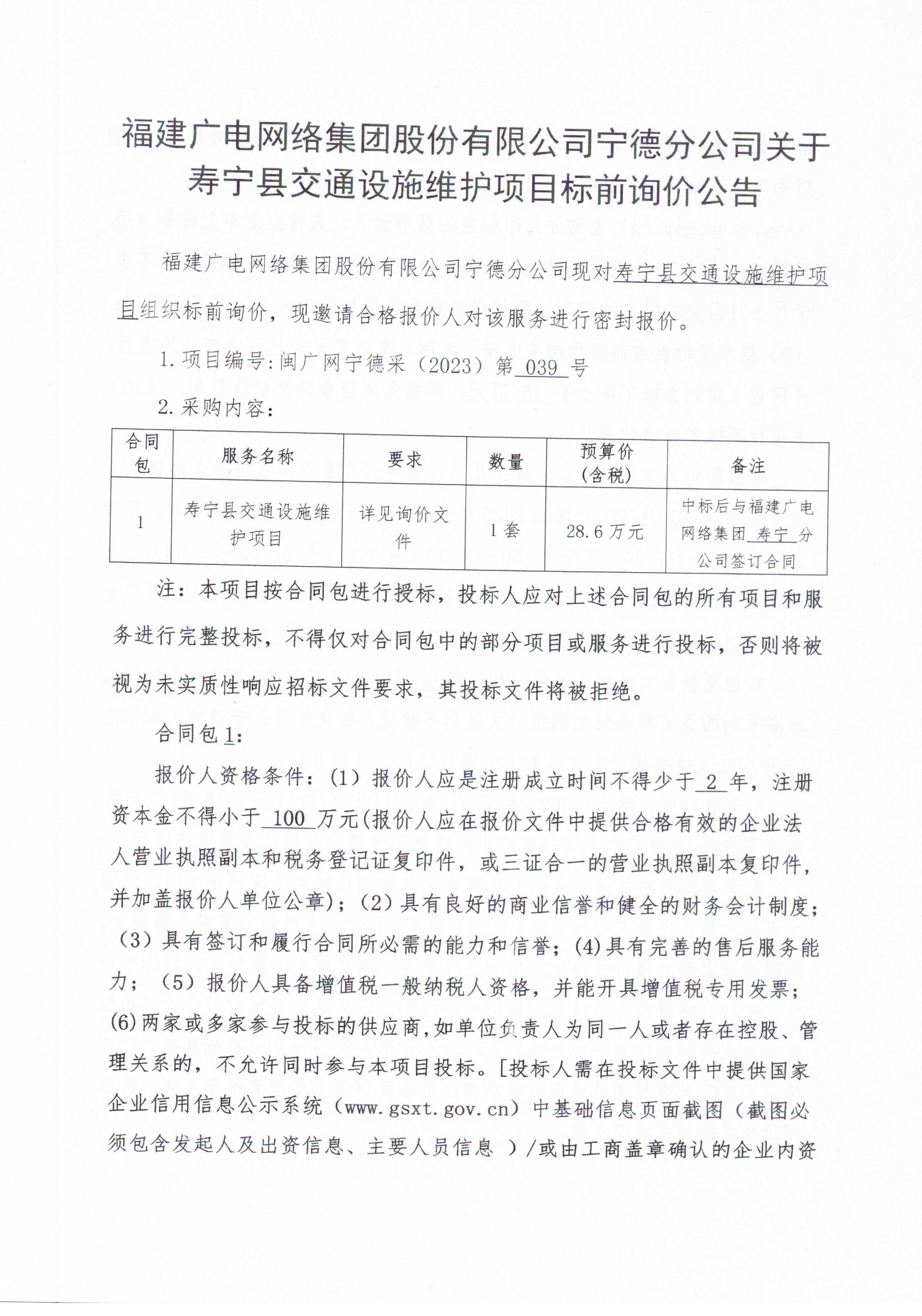 关于寿宁县交通设施维护项目(标前询价)采购公告