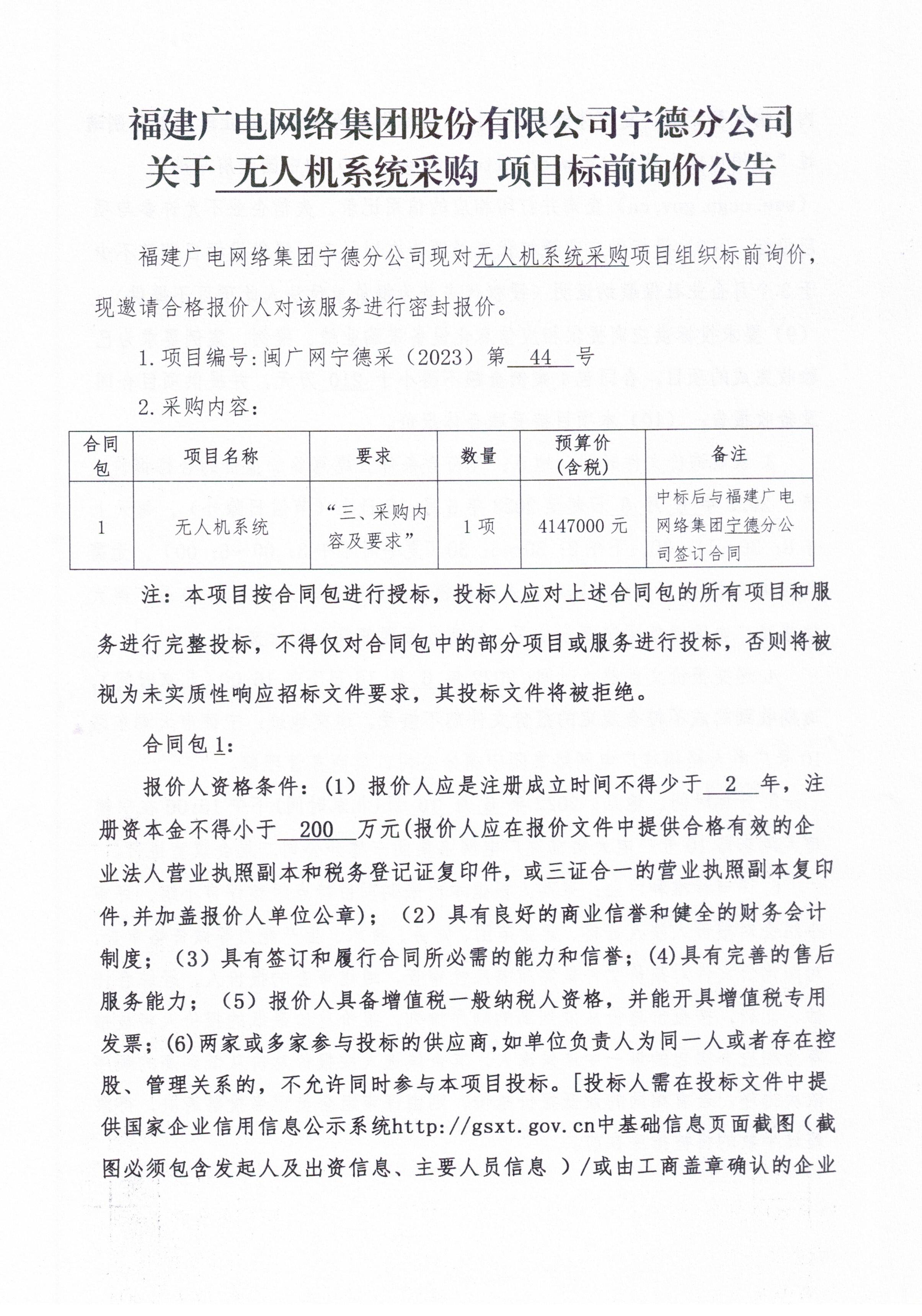 福建广电网络集团宁德分公司无人机系统采购项目公告