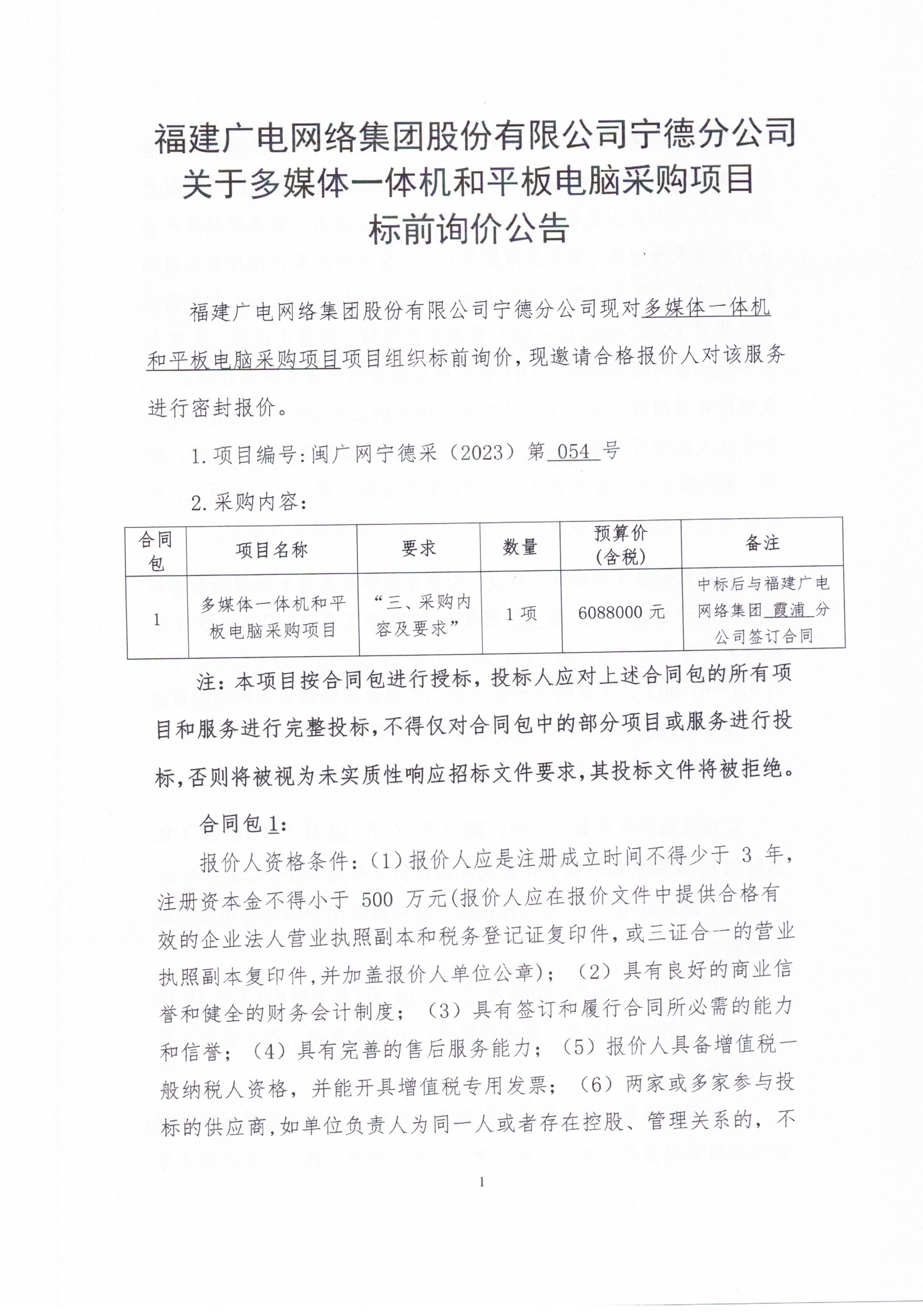 新利网上注册首页(中国)官方网站宁德分公司关于多媒体一体机和平板电脑采购项目标前询价公告