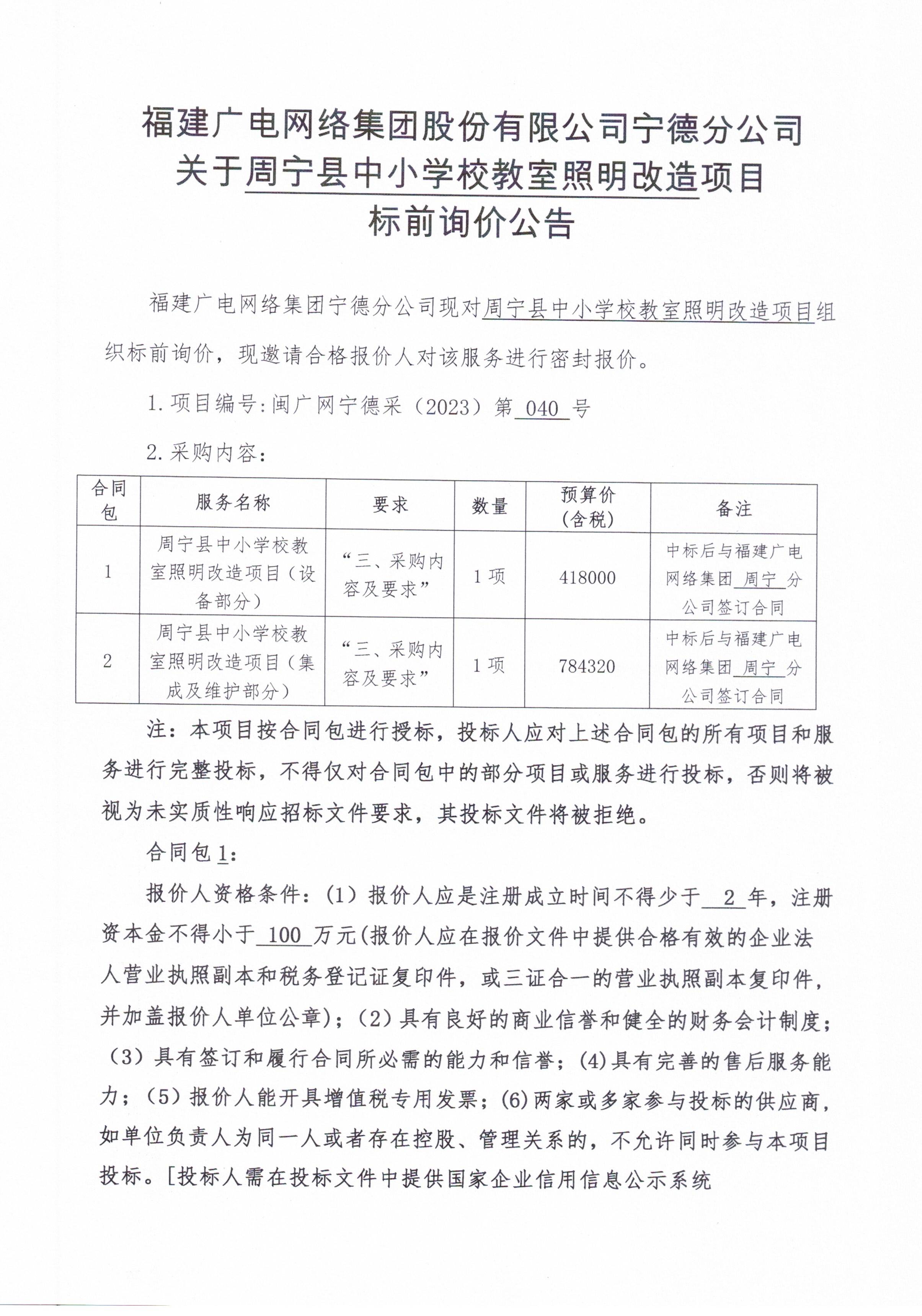 宁德分公司关于周宁县中小学校教室照明改造项目标前询价公告