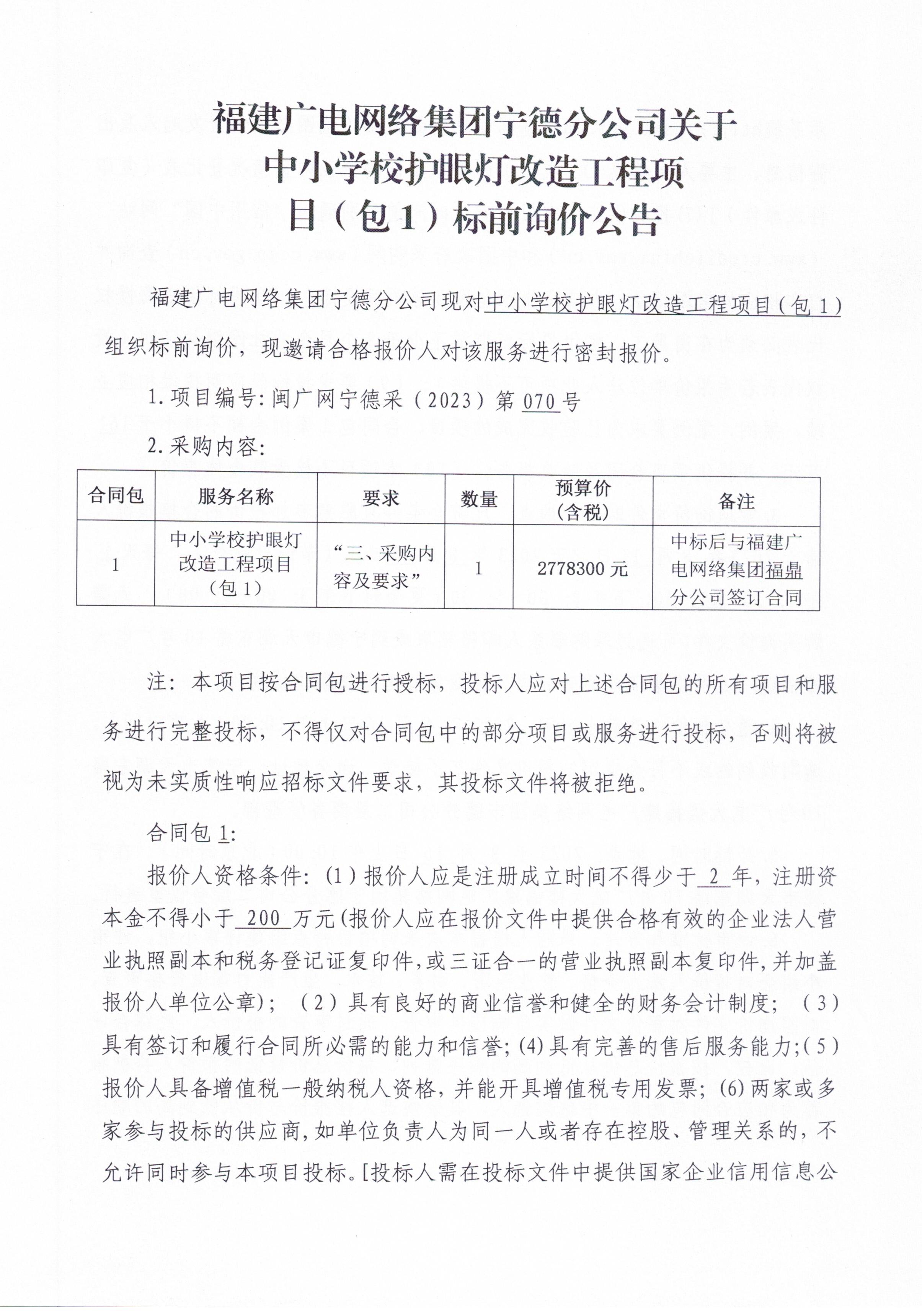 新利网上注册首页(中国)官方网站宁德分公司关于福鼎中小学校护眼灯改造工程项目(包1)标前询价公告