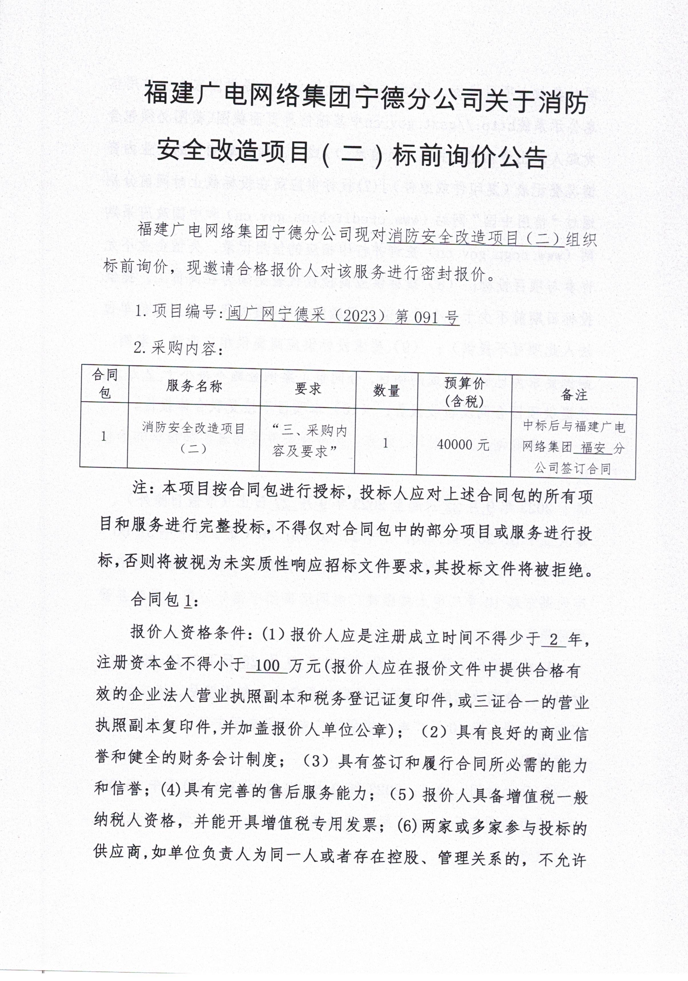 福建广电网络集团宁德分公司关于消防安全改造项目(福安市人民政府城南街道办事处)标前询价公告