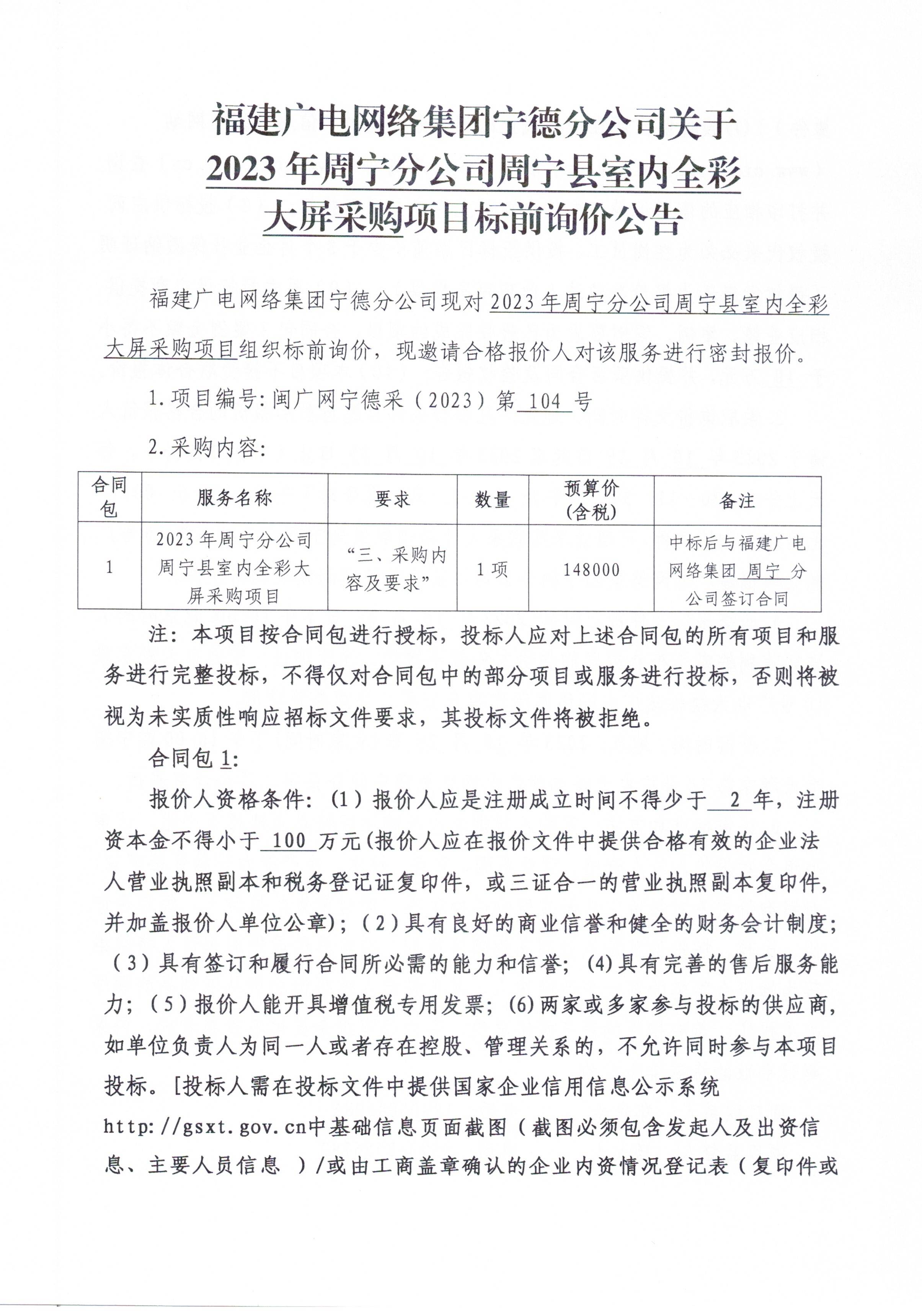 新利网上注册首页(中国)官方网站宁德分公司关于2023年周宁分公司室内全彩大屏采购项目