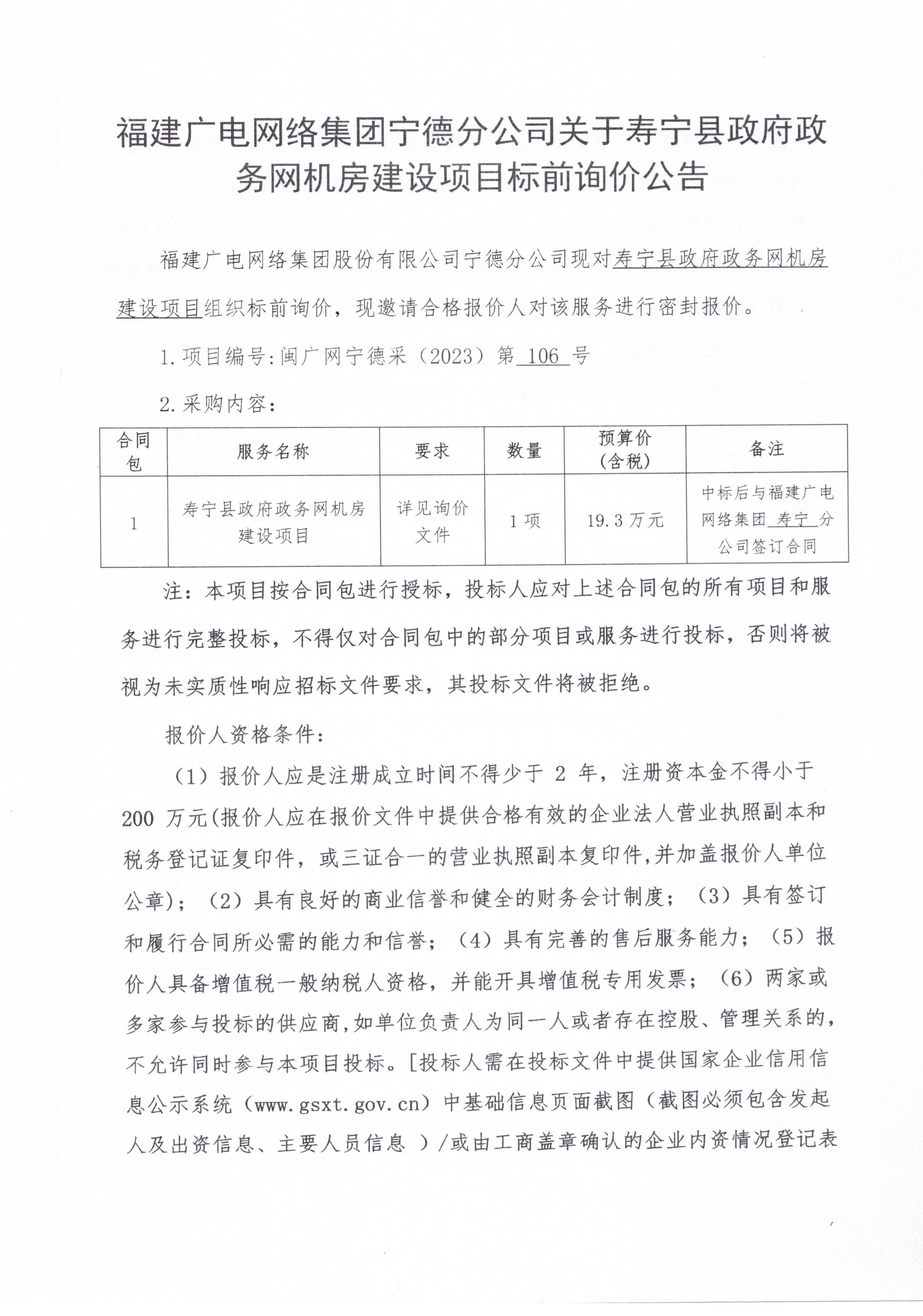 新利网上注册首页(中国)官方网站宁德分公司关于寿宁县政府政务网机房建设项目标前询价公告