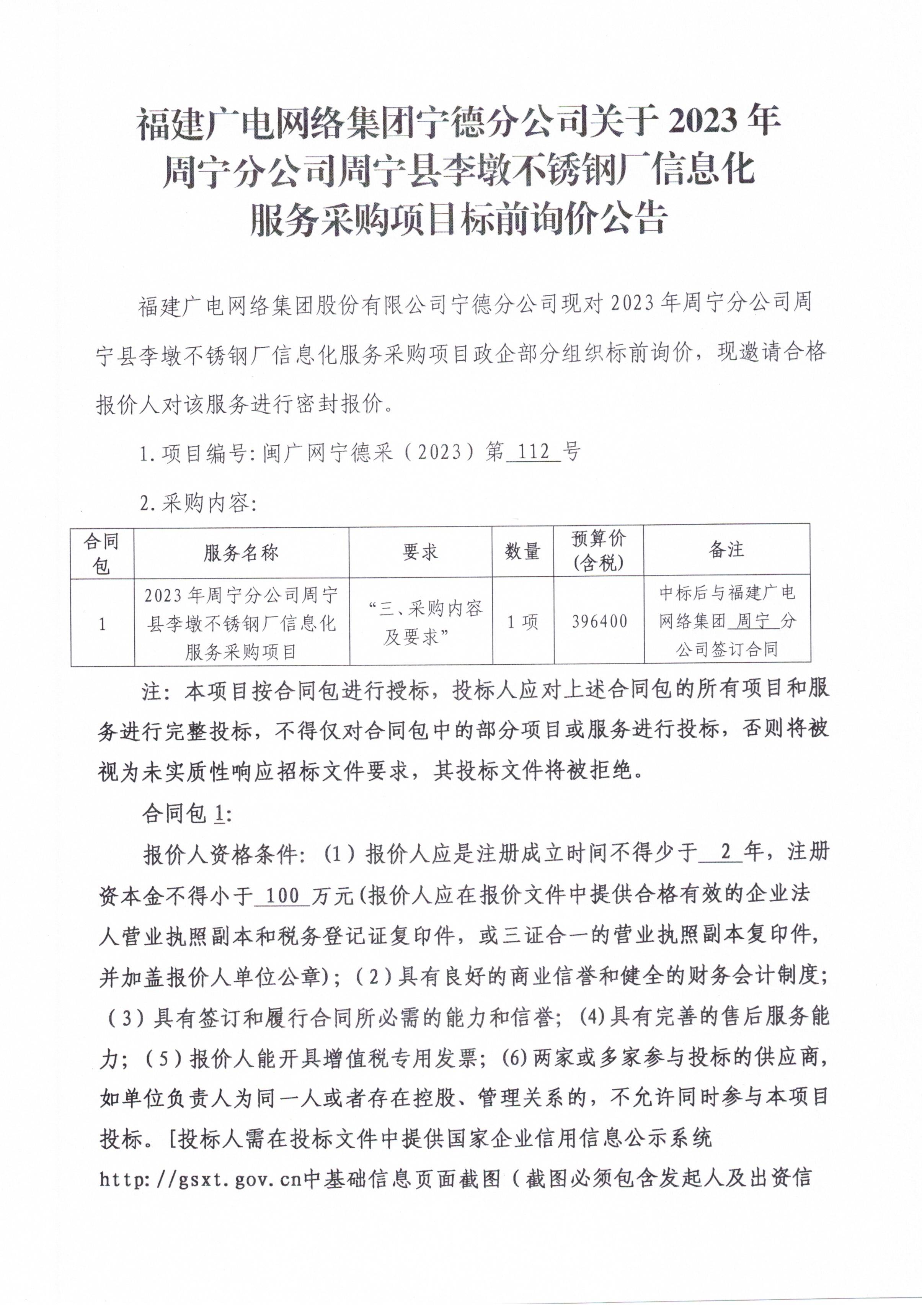 2023年周宁分公司周宁县李墩不锈钢厂信息化服务采购项目标前询价公告