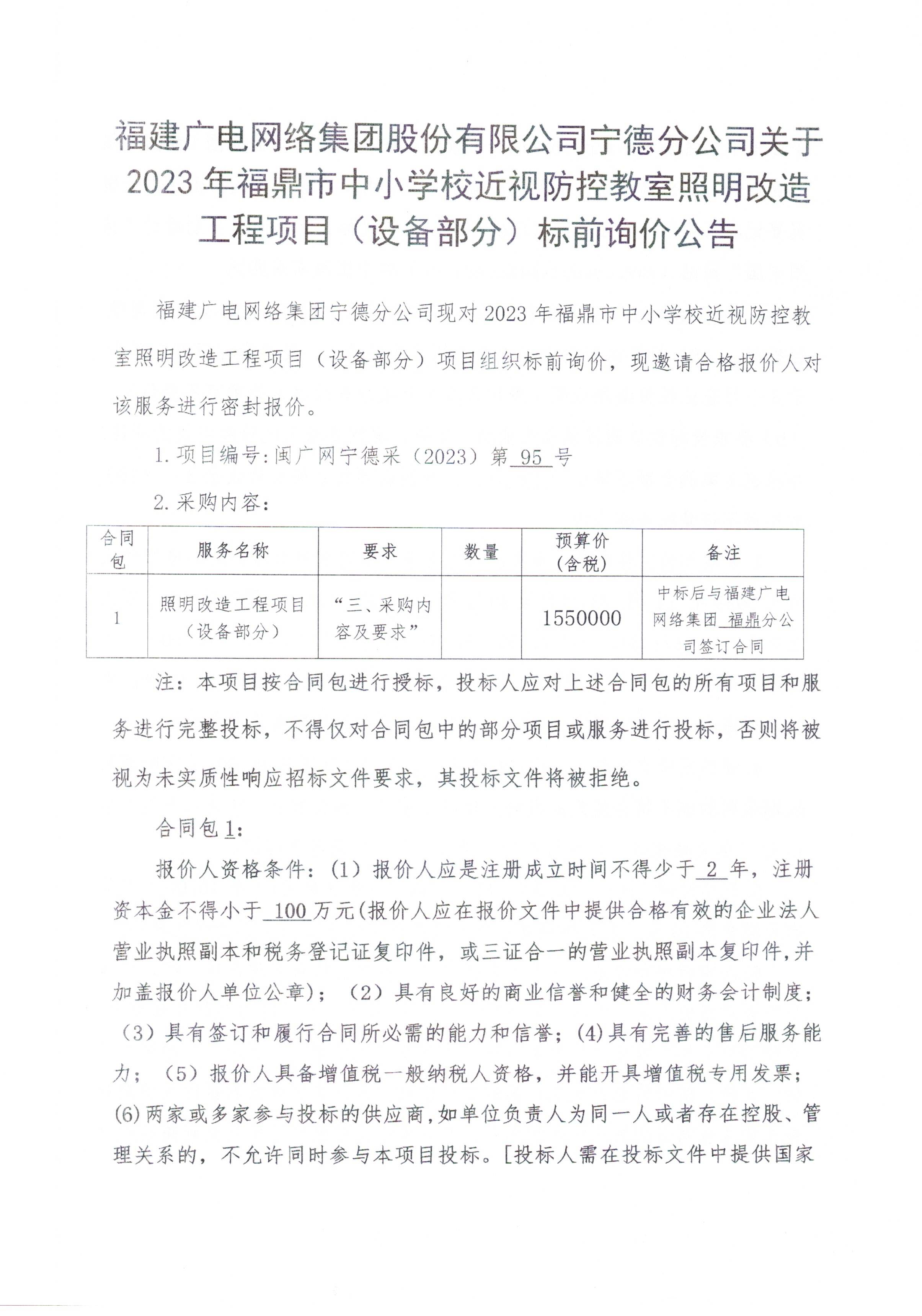 2023年福鼎市中小学校近视防控教室照明改造工程项目(设备部分)标前询价公告