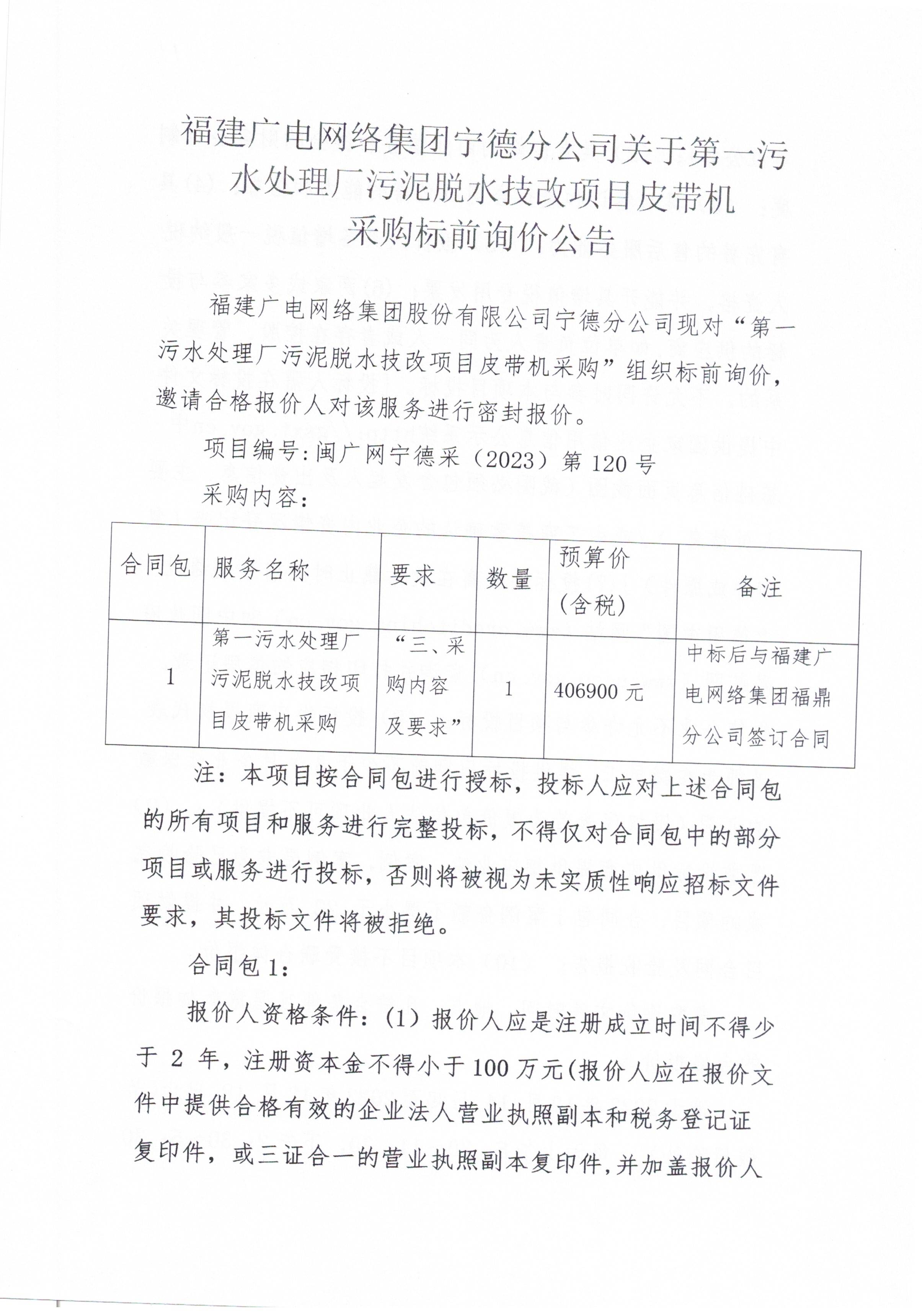 福建广电网络集团宁德分公司关于第一污水处理厂污泥脱水技改项目皮带机采购标前询价公告