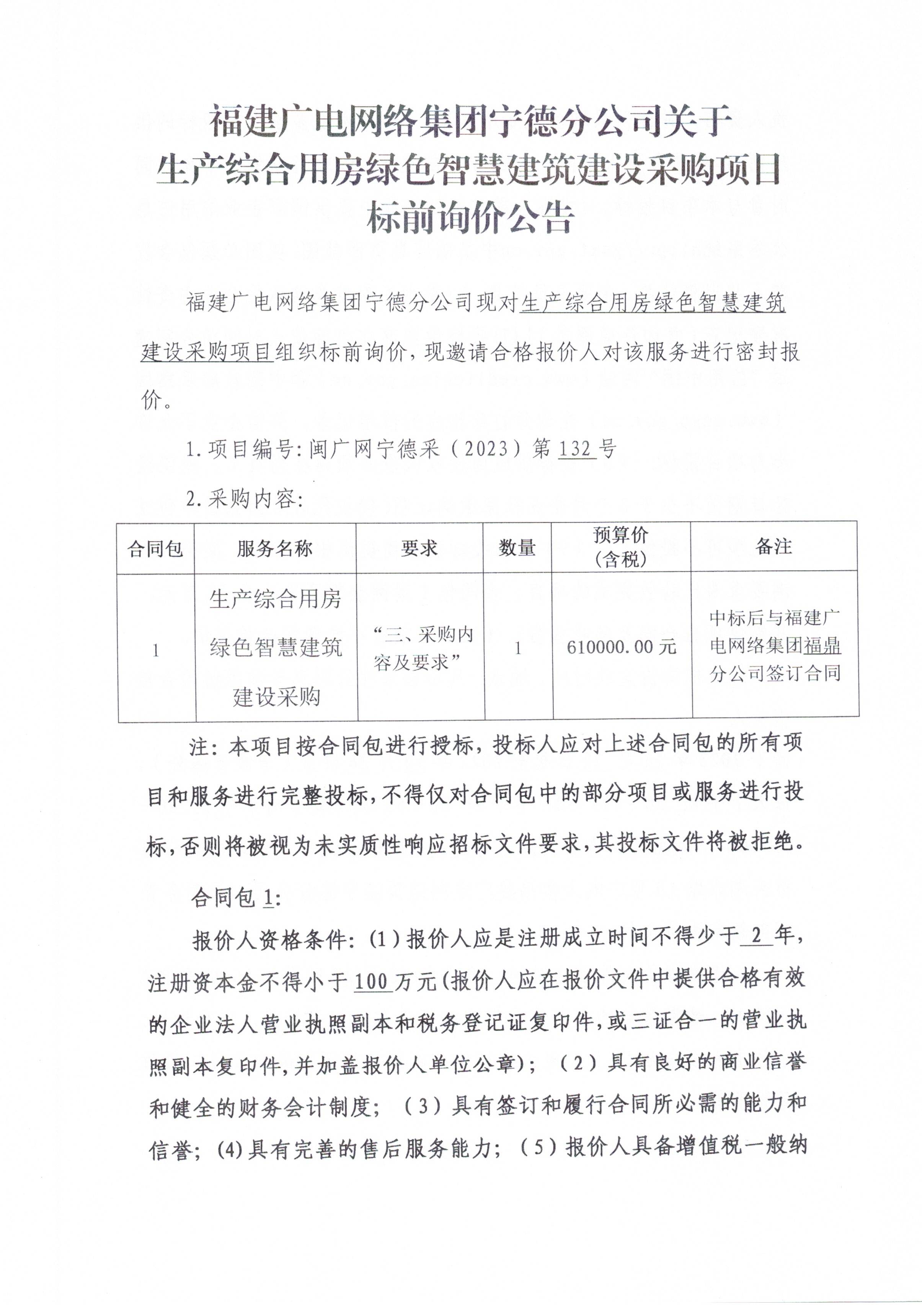 新利网上注册首页(中国)官方网站宁德分公司生产综合用房绿色智慧建筑建设采购项目标前询价公告