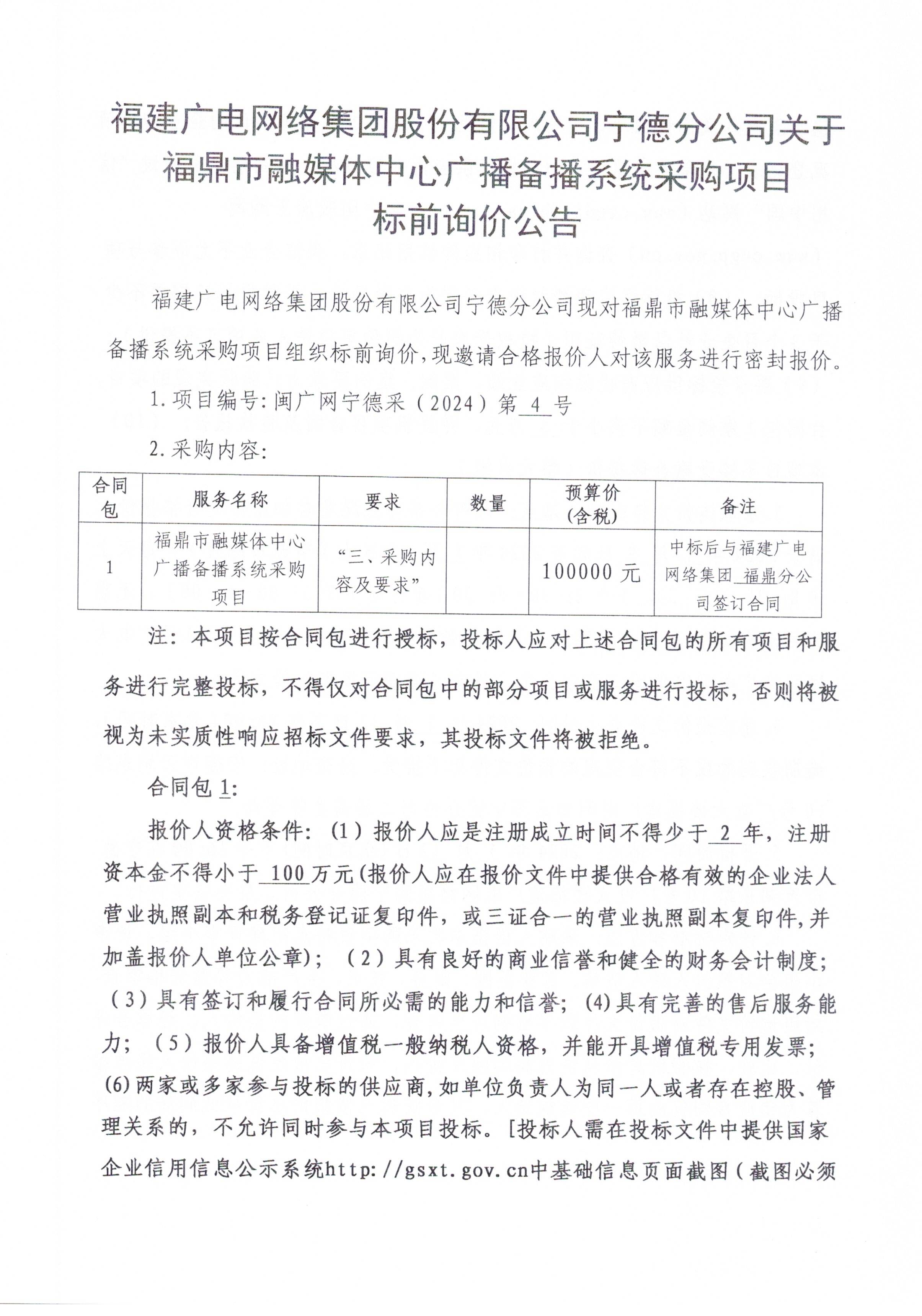 福建广电网络集团宁德分公司关于福鼎市融媒体中心广播备播系统采购项目(标前询价)
