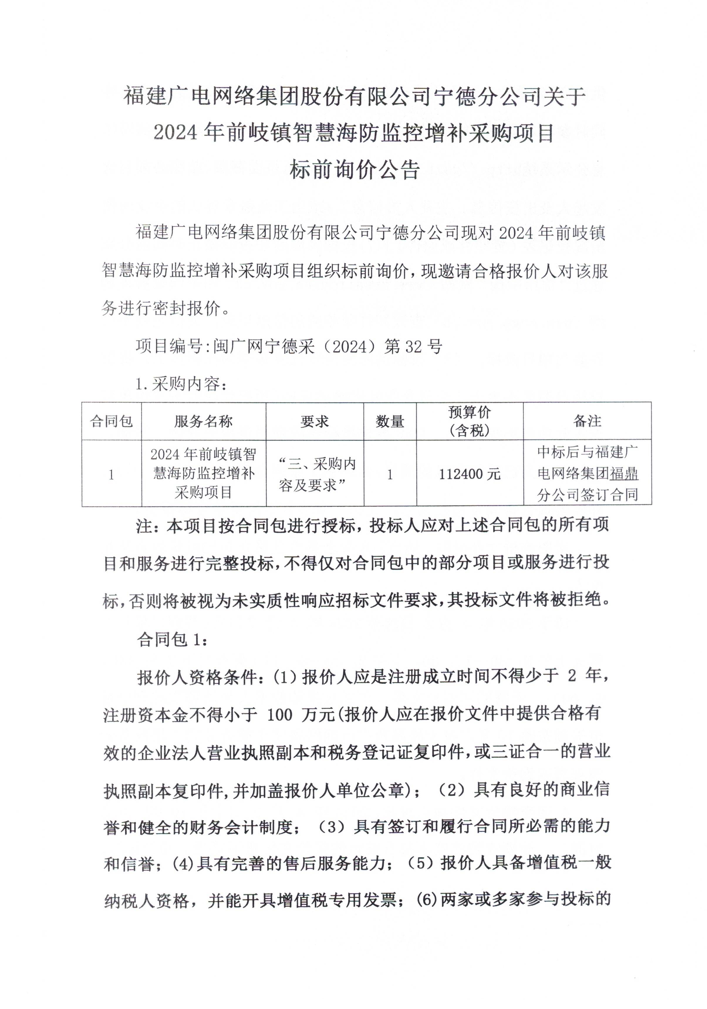 新利网上注册首页(中国)官方网站宁德分公司关于2024年前岐镇智慧海防监控增补采购项目标前询价公告