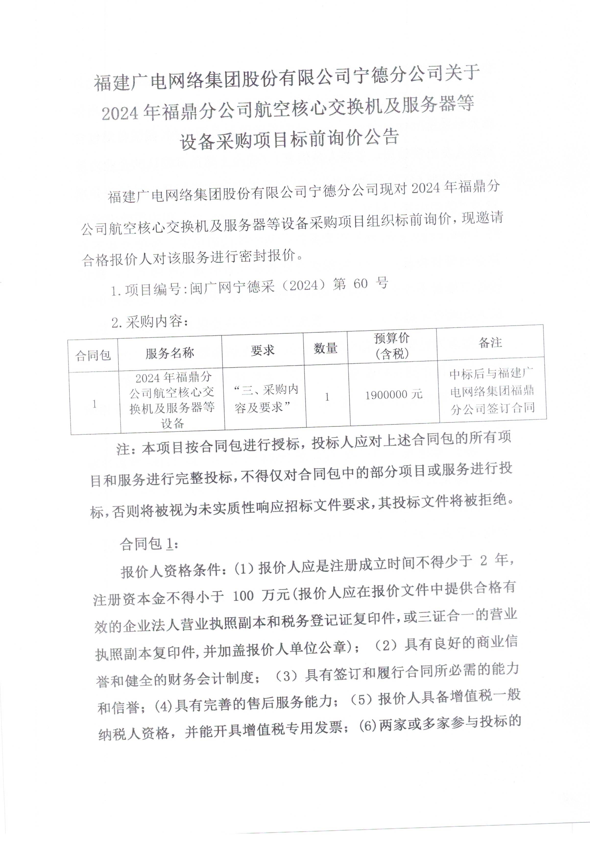 福鼎分公司航空核心交换机及服务器等设备采购项目公告