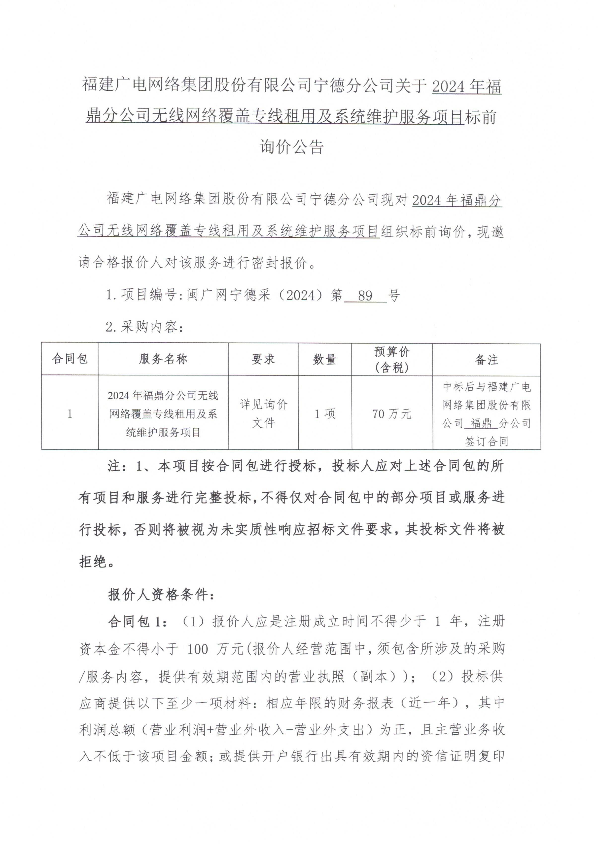 福建广电网络集团股份福鼎分公司无线网络覆盖专线租用及系统维护服务项目
