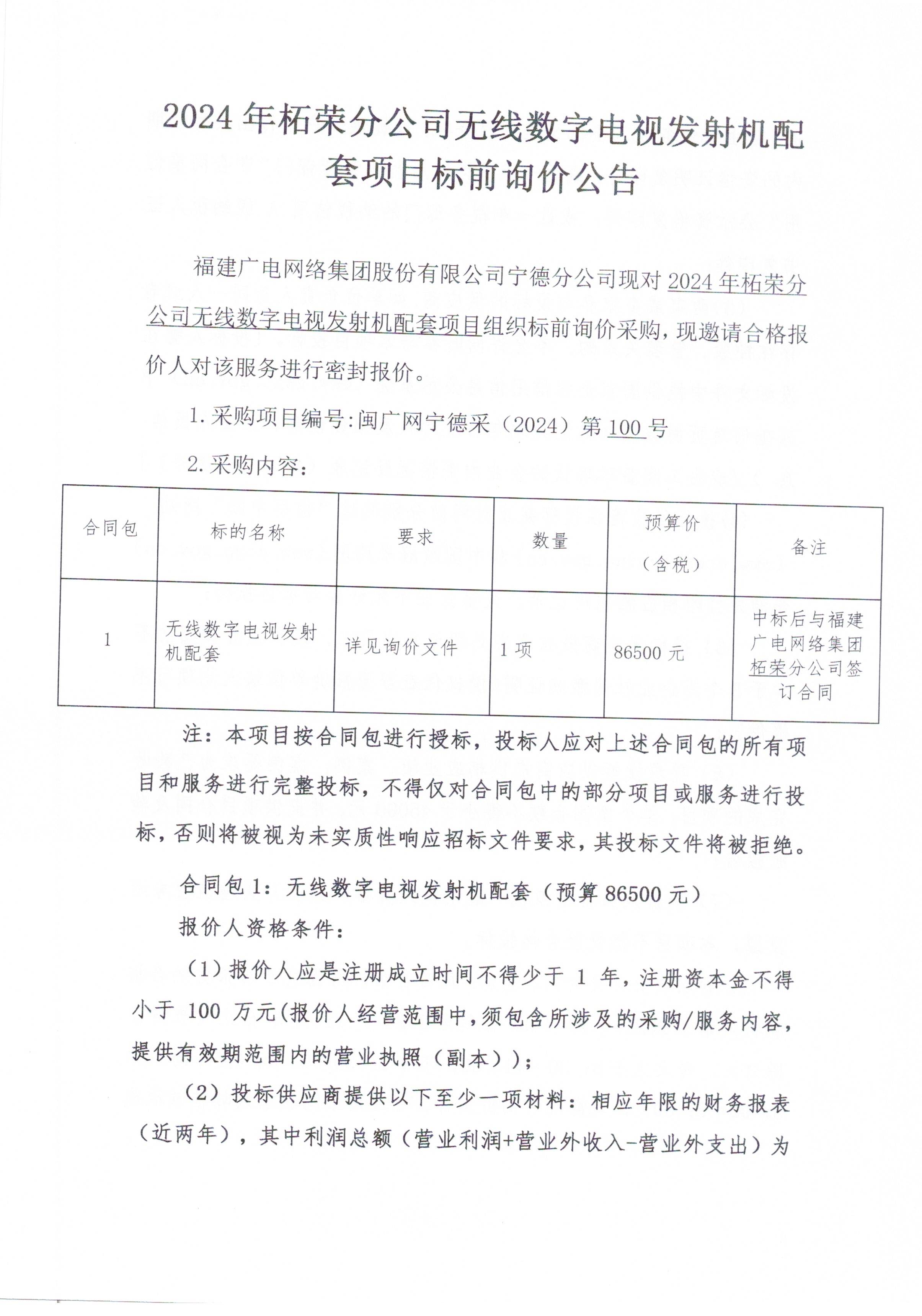 2024年柘荣分公司无线数字电视发射机配套项目