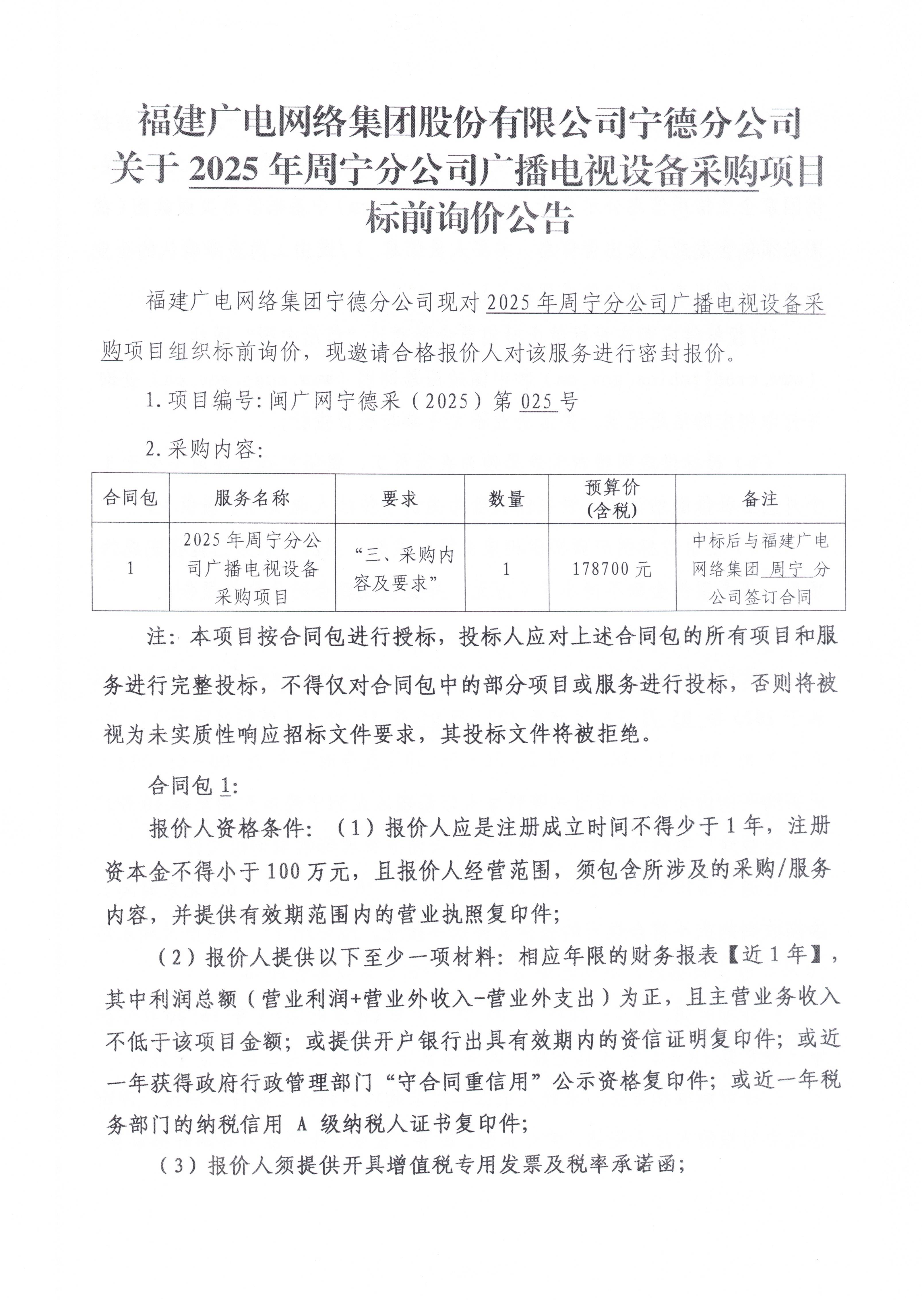 新利网上注册首页(中国)官方网站宁德分公司关于2025年周宁分公司广播电视设备采购项目