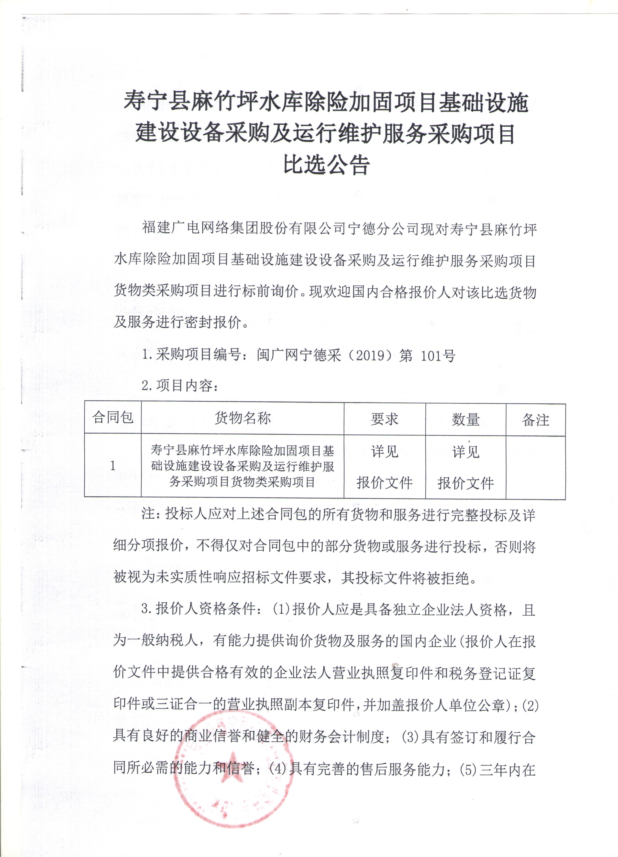 寿宁县麻竹坪水库除险加固项目基础设施建设设备采购及运行维护服务采购项目比选公告