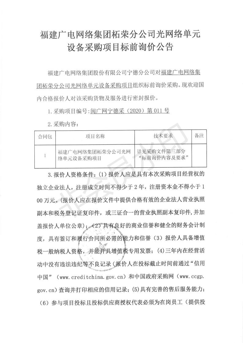 柘荣分公司光网络单元设备采购项目标前询价公告