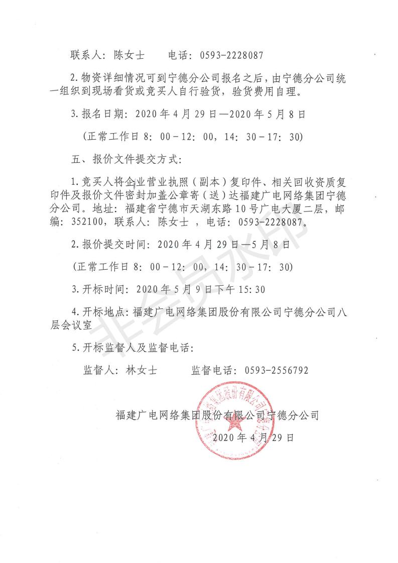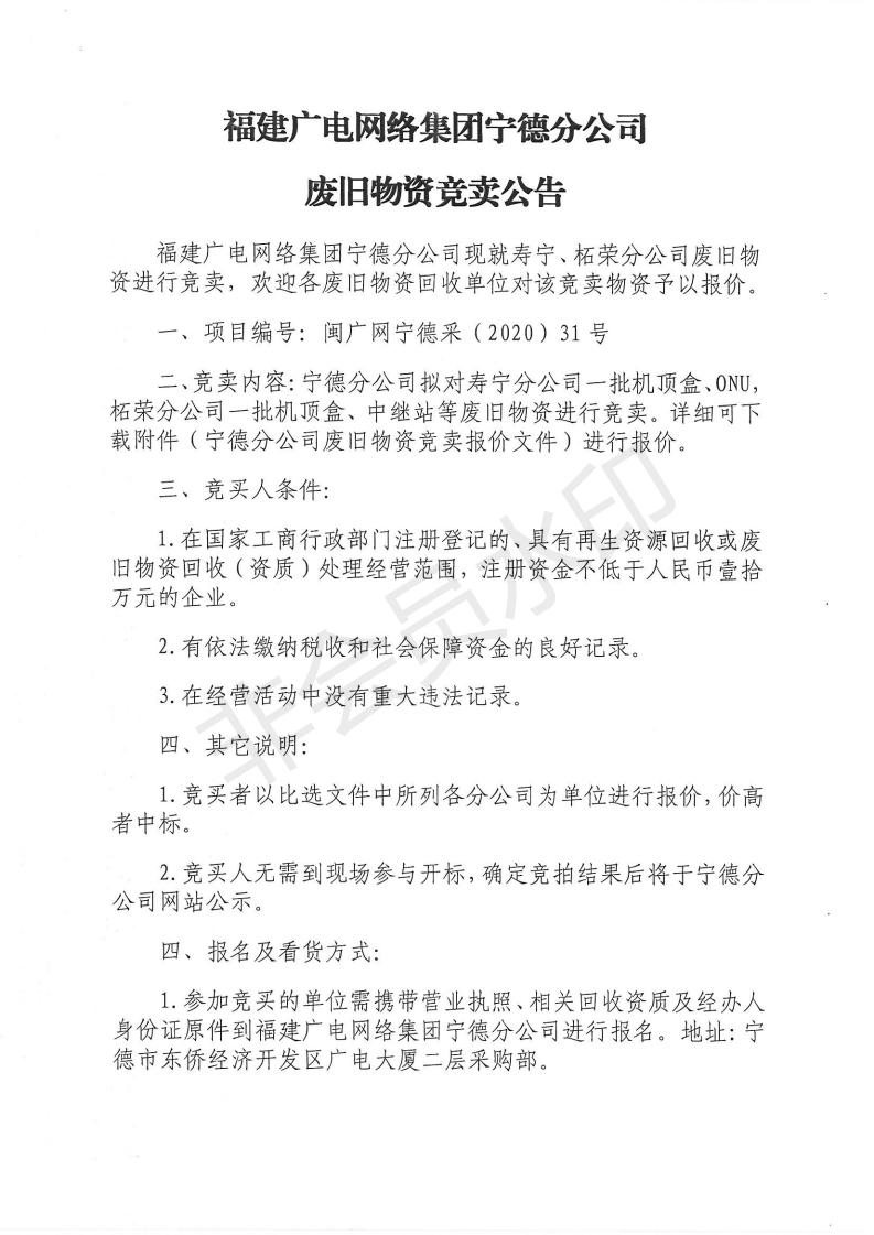 寿宁、柘荣分公司废旧物资竞卖公告
