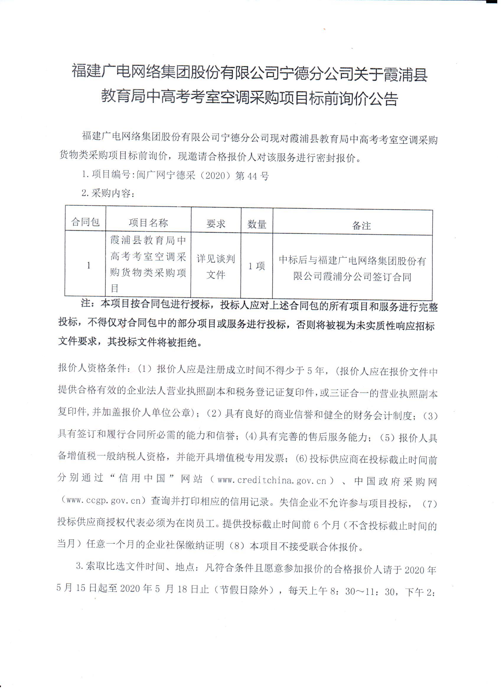 霞浦县教育局中高考考室空调采购项目标前询价公告