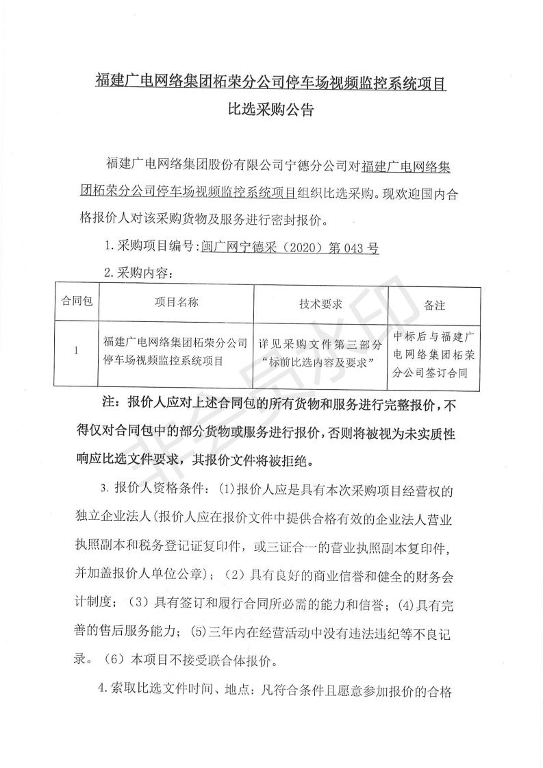 柘荣分公司停车场视频监控系统项目比选采购公告