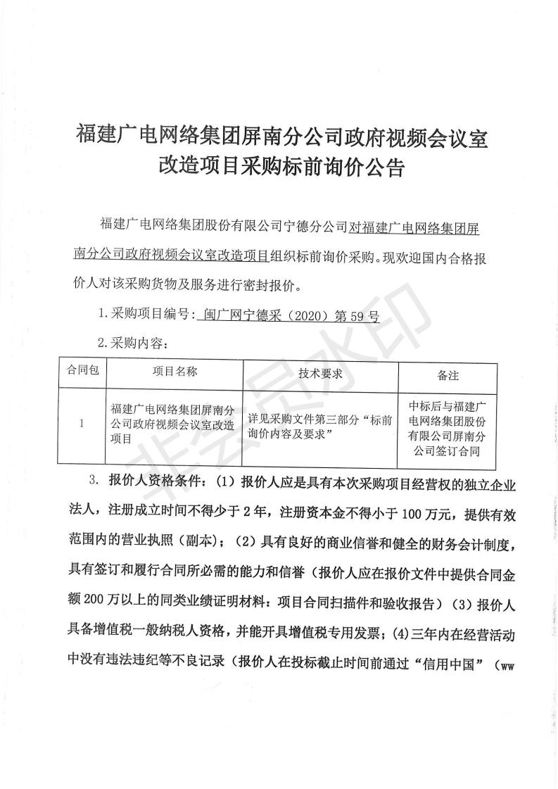 屏南分公司政府视频会议室改造项目采购标前询价公告