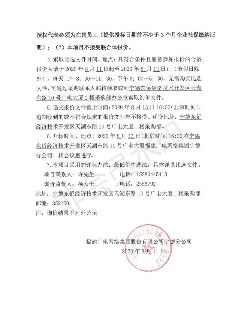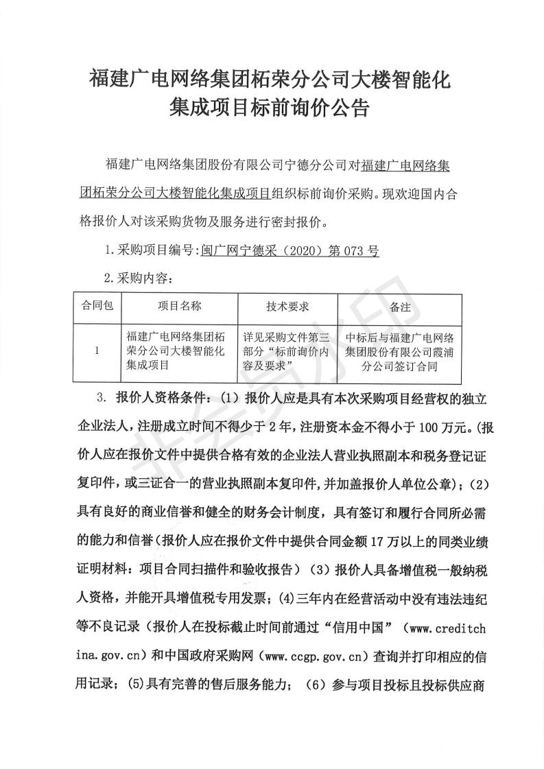 柘荣分公司大楼智能化集成项目标前询价公告