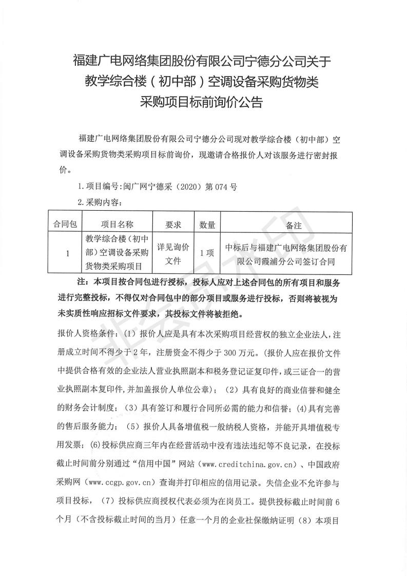 宁德分公司教学楼空调设备采购货物类采购项目标前询价公告