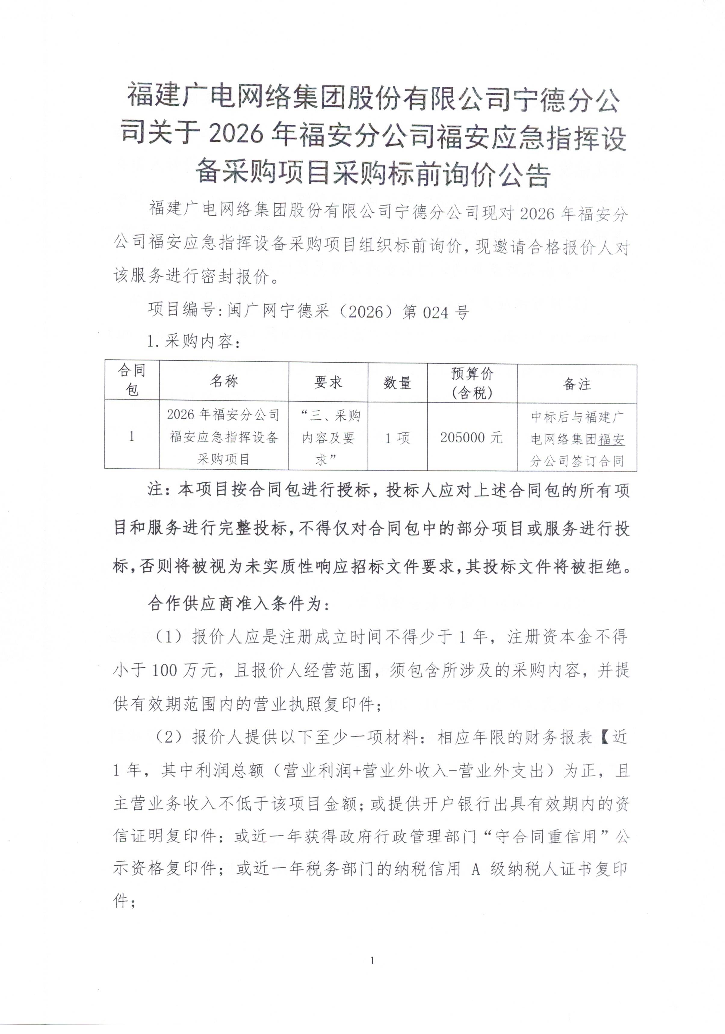 2026年福安分公司福安应急指挥设备采购项目公告